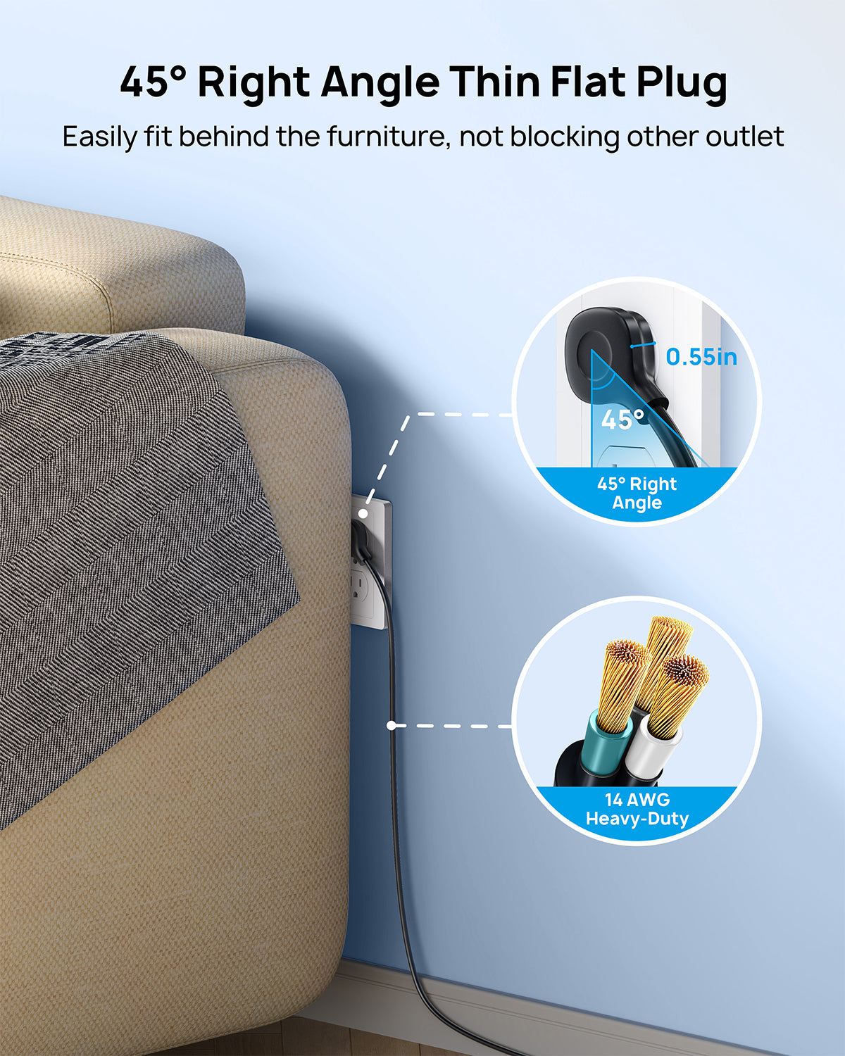 Power strip flat plug. Made of 14awg pure copper, the 5-foot extension cord is heavy-duty and has better current carrying capacity (15a). The low-profile space-saving 45° angled flat plug doesn’t block the bottom receptacle