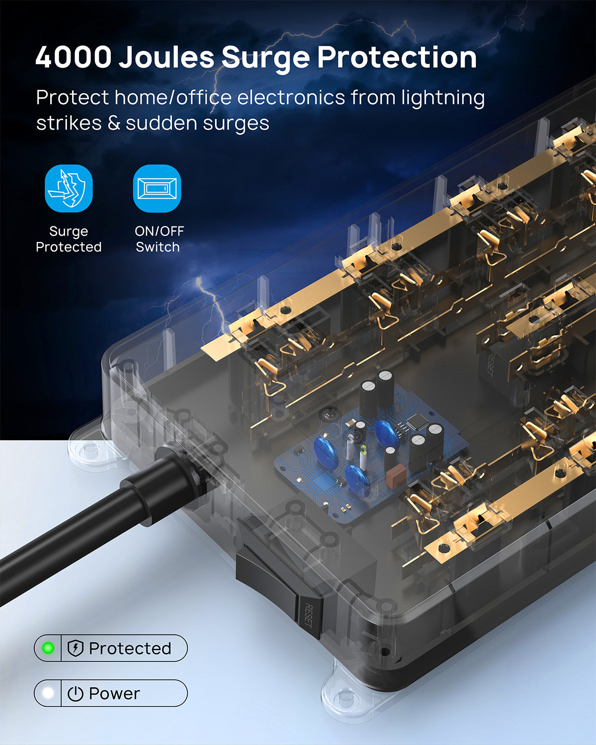 Safety assurance. It’s ETL listed, and made of the top-grade ul94 v-0 flame-retardant material. With 4000j surge protection, it safeguards your tv, computers, phones & office equipment from potentially damaging power disturbances, creating peace of mind