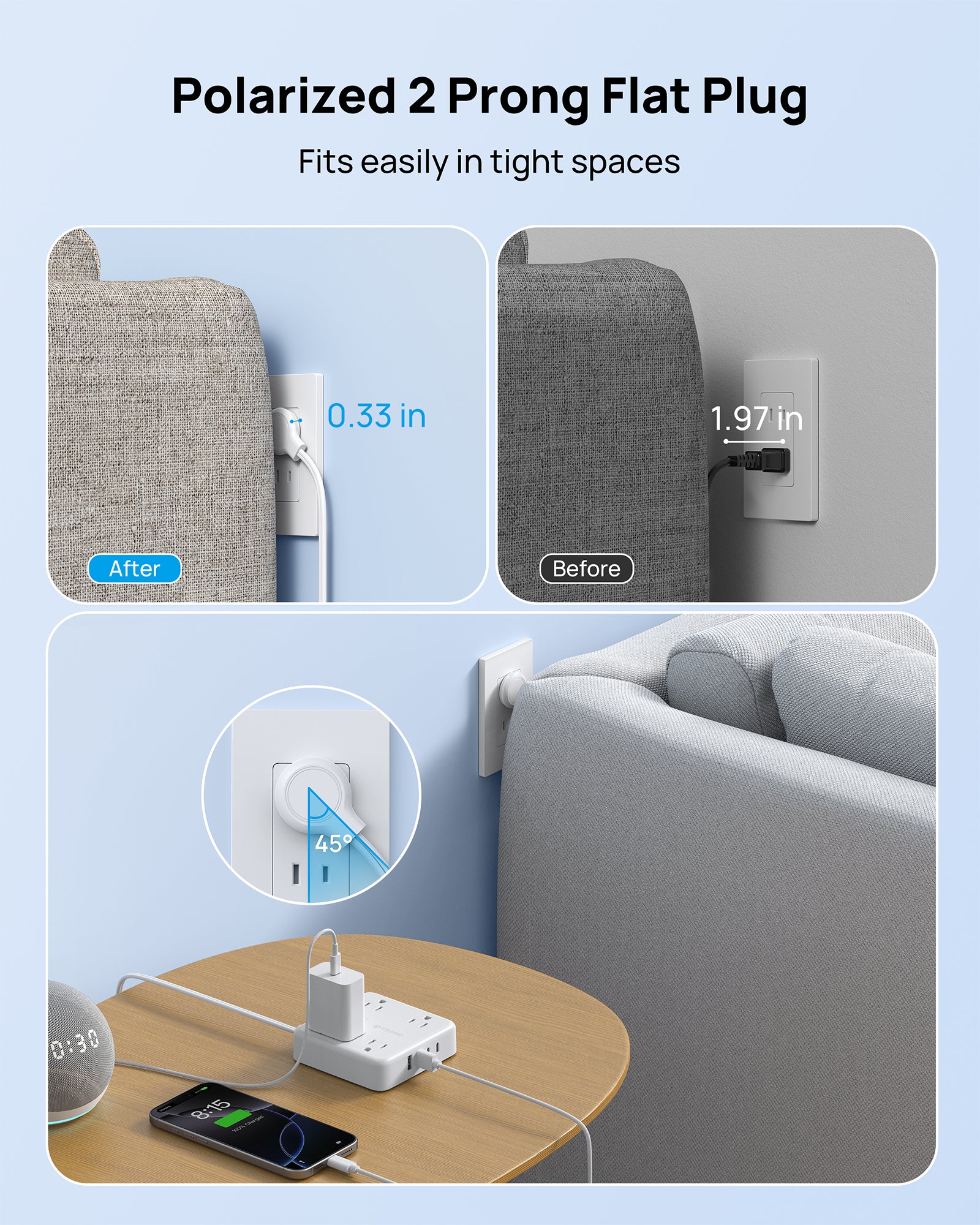 【2 Prong Flat Plug Power Strip】The two prong to three prong power strip has a thin polarized flat plug(only 0.33 inches thick) that can help you keep your furniture close to the wall and hide the plug discreetly behind furniture. The design with a 45° right angle flat plug won't affect the bottom outlet after inserting it into the top socket of your wall outlet