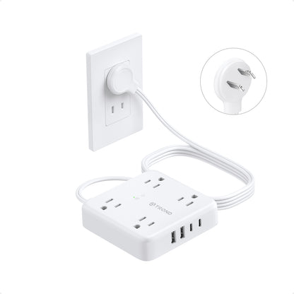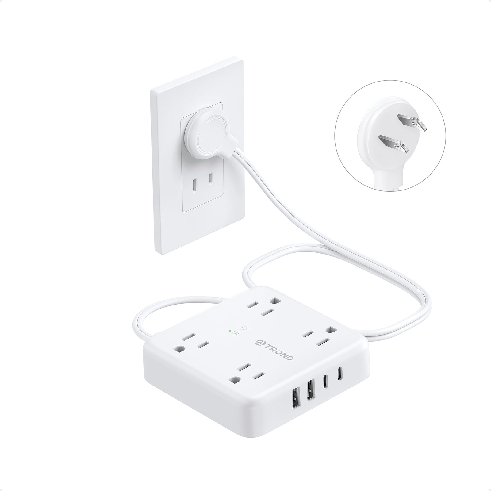 【8-in-1 Charging Station】This compact 2 prong power strip with 4 AC outlets (max 1250W/10A), 2 USB-C ports, and 2 USB-A ports can safely power up to 8 devices without unplugging each other. Compatible with smartphones, tablets, laptops, cameras, e-readers, and more. The design of this outlet is widely spaced, allowing you to use all four outlets. Perfect for large plugs