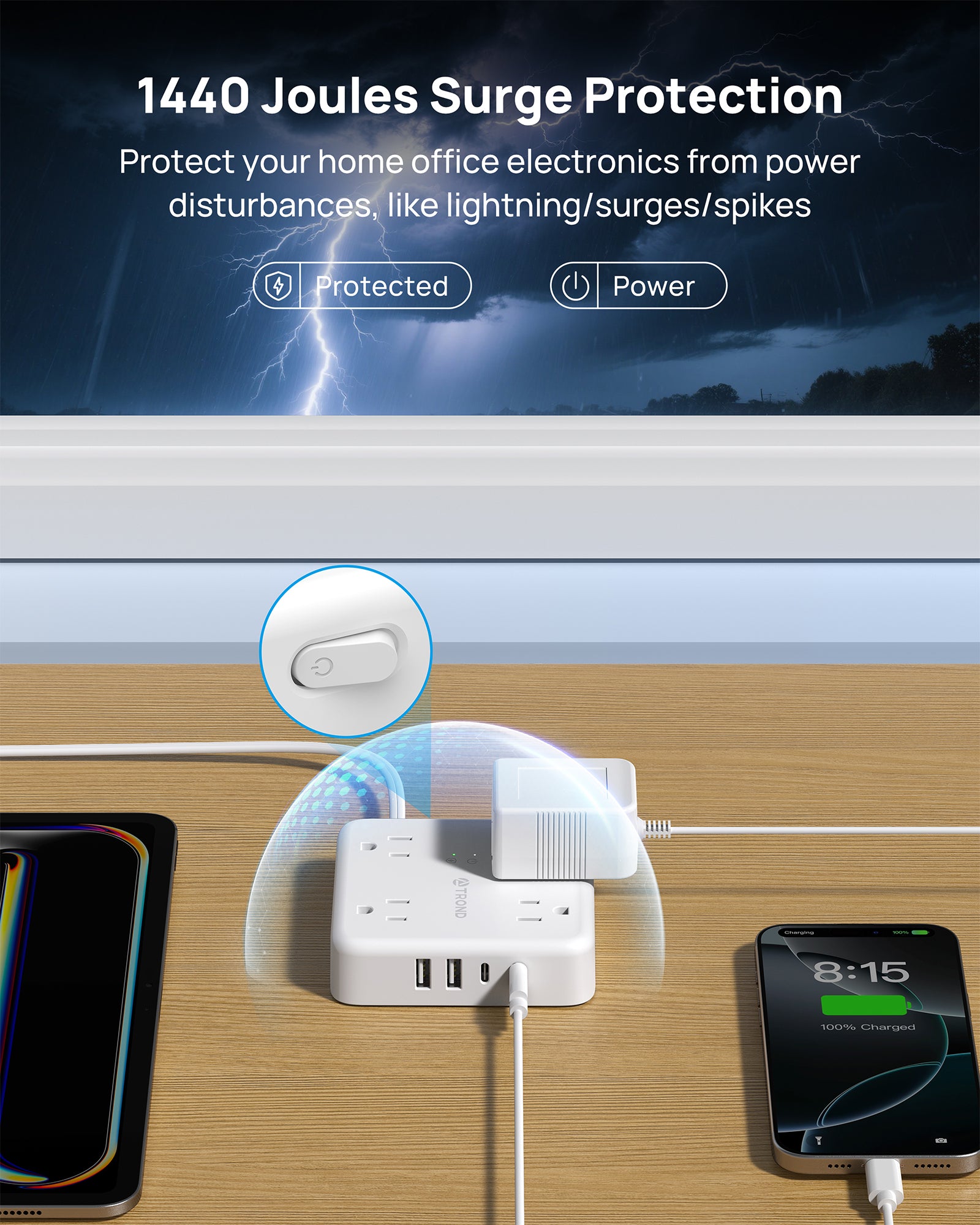 【Two Prong Surge Protector】The flat plug power strip provides 1440J protection for your home office electronics(computers, TV setups, or other valuable electronics) against power disturbances. The green LED light indicates protection and a circuit breaker for overload protection. Made of top-grade UL94 V-0 flame-retardant PC & ABS materials to improve safety and durability