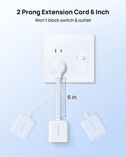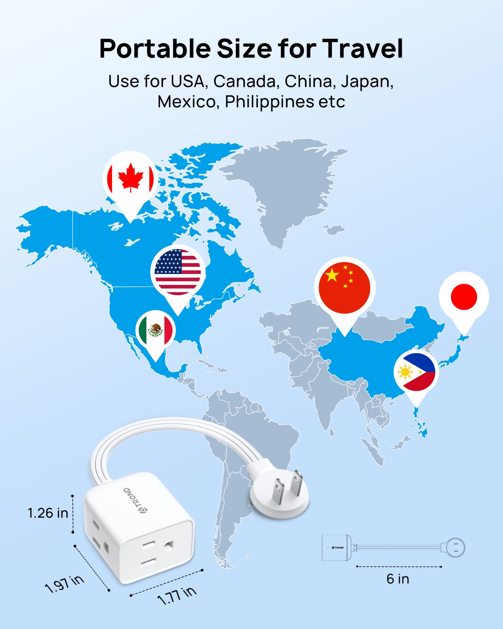 【2 Prong Extension Cord】Compact and lightweight, the power outlet extender with 6 inch cable is easy to carry and suitable for any occasion like kitchen, bedroom, hotel, college dorm room, or home office. The Type A plug even makes it useful when traveling in Canada, China, Japan, Mexico, Philippines