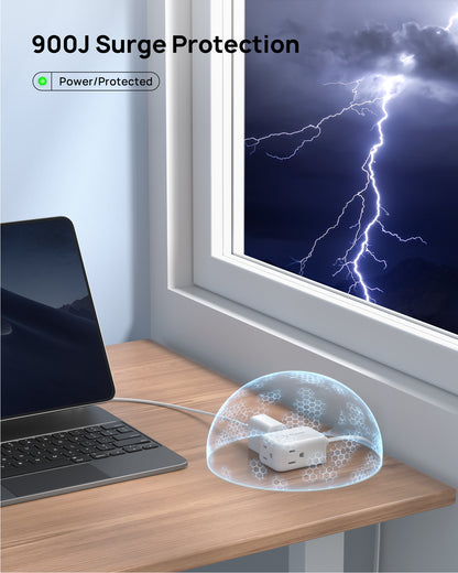 【Surge Protector Power Strip】With a robust 900 joules rating, it provides reliable protection for your computer, TV setup, or other home office electronics against power disturbances, including lightning, surges, and spikes. The green LED light indicates power and surge protection