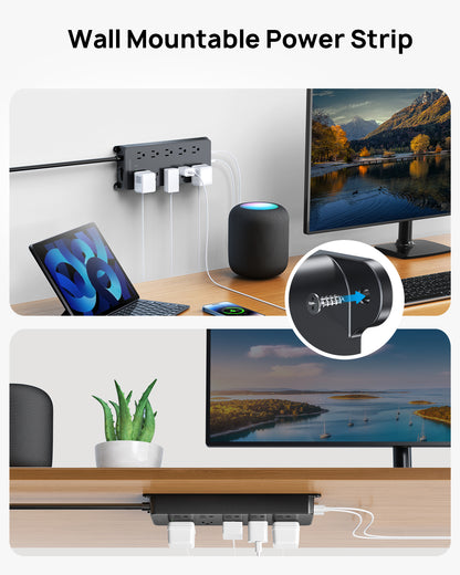 【Wall Mountable Power Strip】This wall mount power strip features four mounting holes on both sides, allowing it to be securely attached to a wall using screws. This surge protector is ideal for mounting in various locations, such as an entertainment center, behind a TV, in a dorm room, guest room, garage, on a desktop, or under desks and counters, as well as on workbenches, helping you save space