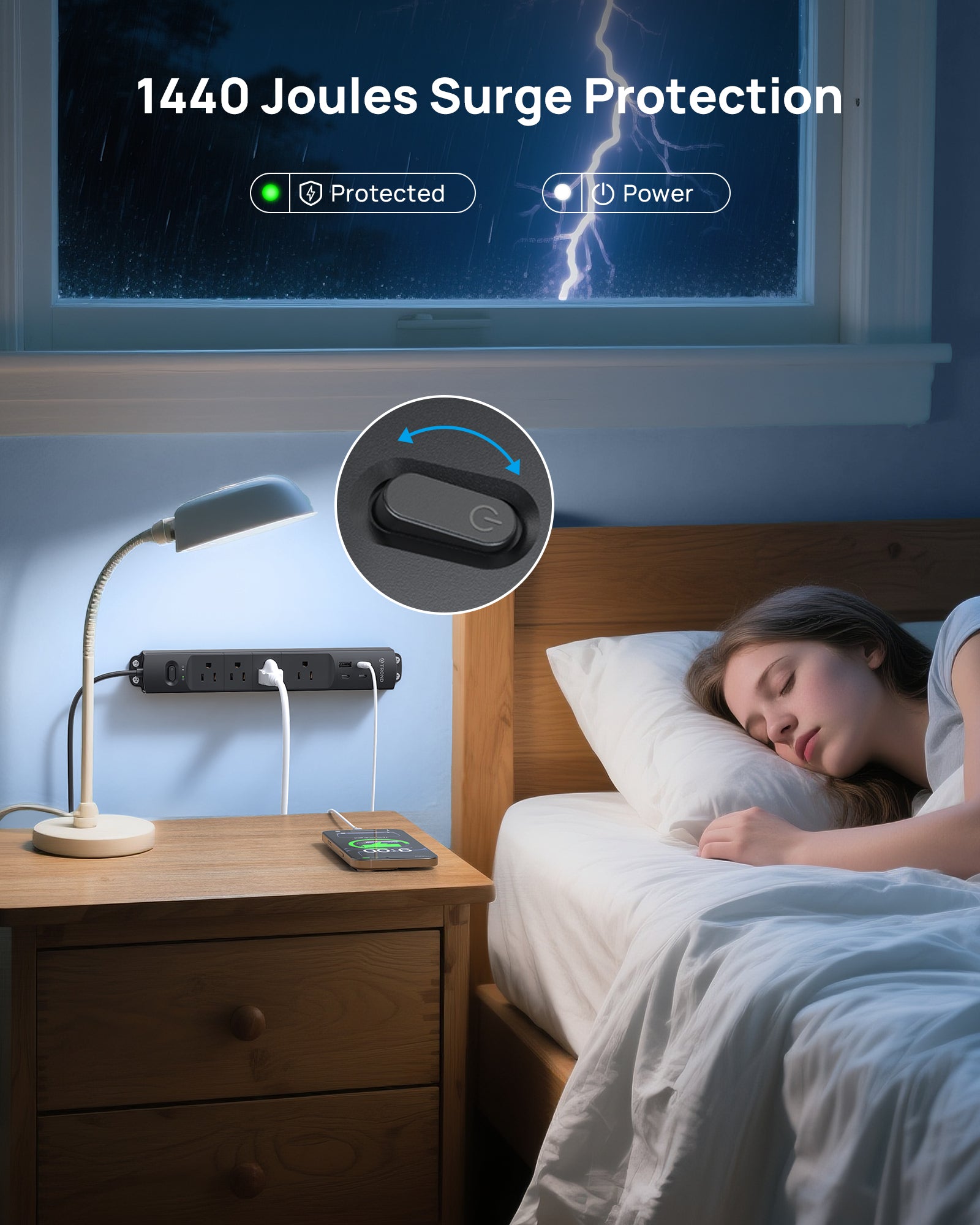 1440J Surge Protection - The surge protector with USB ports features 1440J built-in surge protection to guard your devices from power surges caused by lightning strikes.