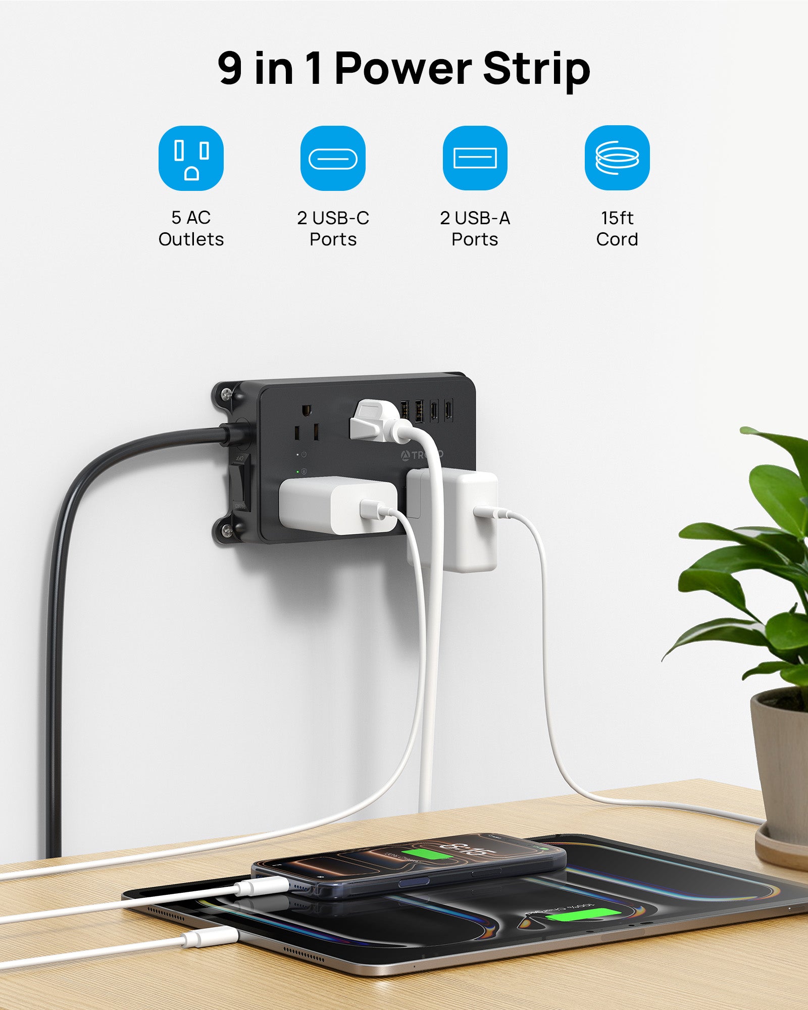 【Power Strip with USB】This power strip transforms a regular wall outlet into 5 grounded AC outlets, plus 2 USB-A and 2 USB-C charging ports, providing power and charging for up to 9 devices. Maximum power: 1875W, 125V/15A, AC 100-250V. Each USB-A port supports a maximum output of 2.4A, while the USB-C port supports up to 3A. The total USB output is 3.0A/15W