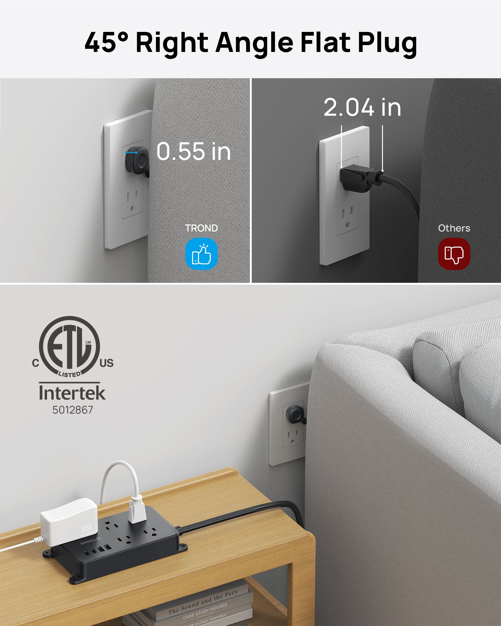 【Power Strips with Surge Protection】This ETL-listed power strip is made from top-grade UL94 V-0 flame-retardant material. With 1300J surge protection, it safeguards your TV, computer, phone, and office equipment from potentially damaging power surges, providing peace of mind