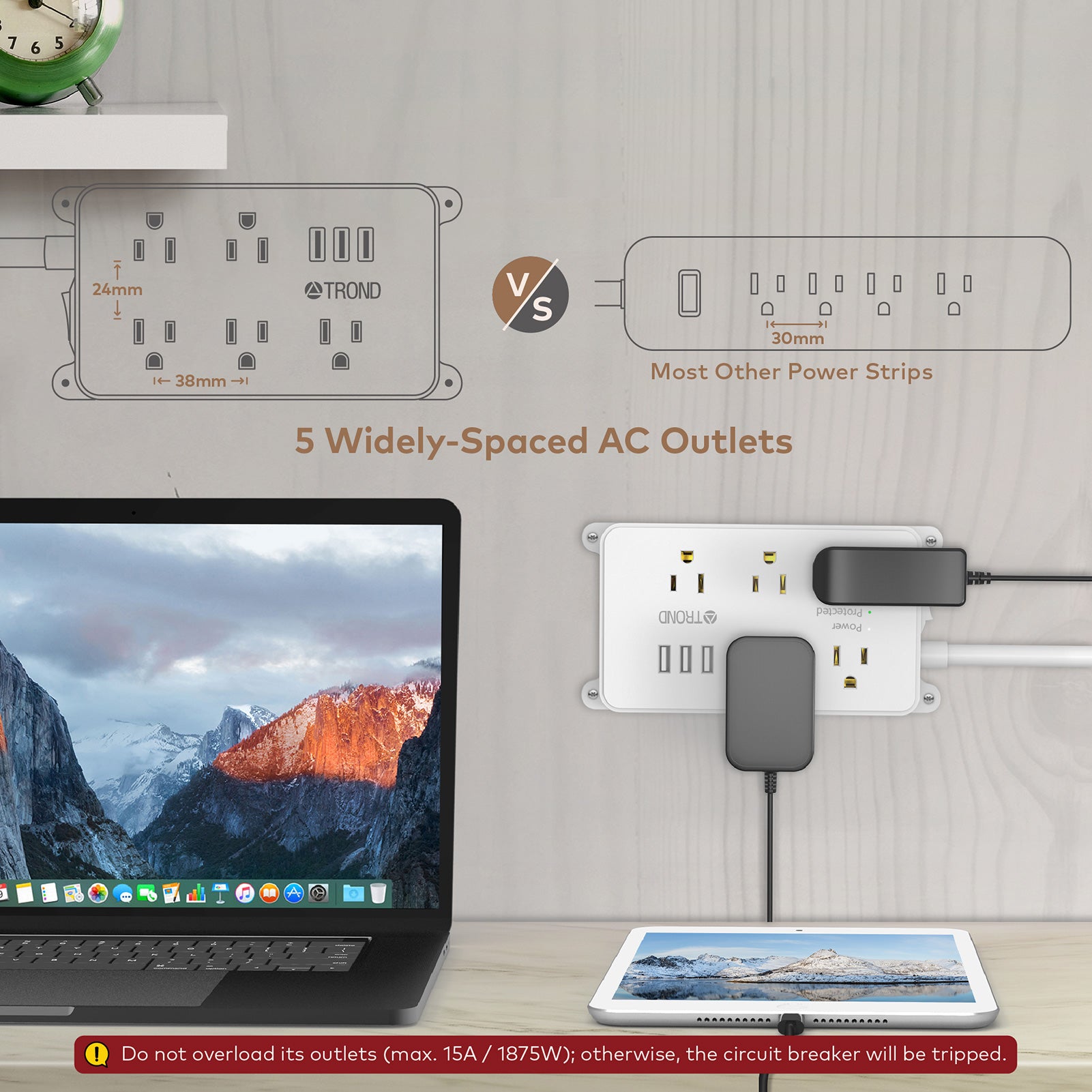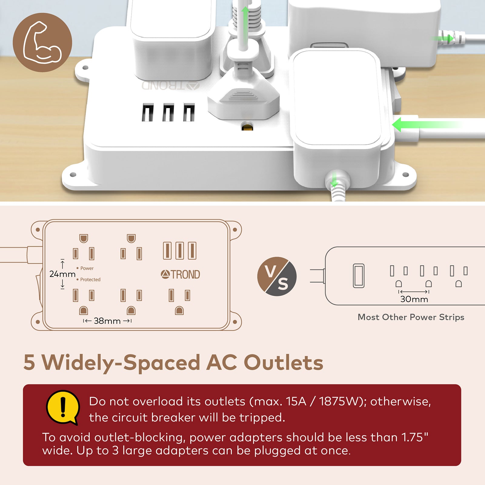 - 5 widely-spaced ac outlets. Larger space in-between (38mm vs. 30mm on other power strips) can accommodate slightly larger power adapters (preferably < 1.75” wide) without blocking adjacent outlets. Easily plug in your pc, monitor, printer, tv & more