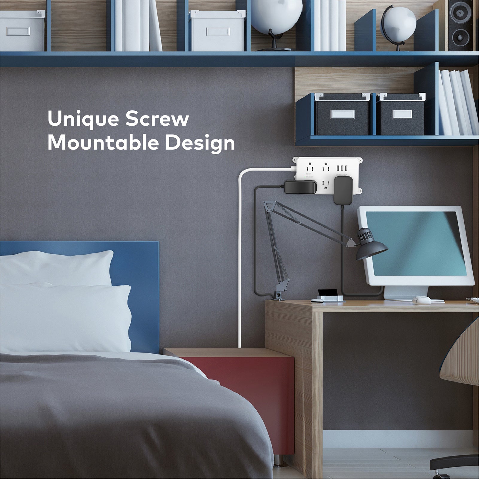 - Screw mountable design. Four screw-mounting tabs allows you to securely install this power strip in various applications, including workbenches, wallmounts, floormounts, under counters & more, which is low-profile and saves desktop space for you
