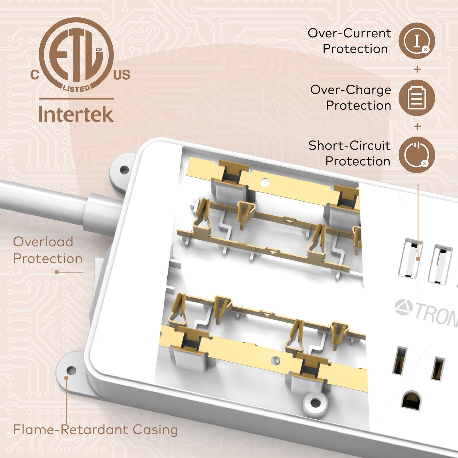 - Safety assurance. It’s etl listed and made of the top-grade ul94 v-0 flame-retardant material. 1300j surge protection safeguards your expensive computers, phones & office equipment from potentially damaging power disturbances, creating peace of mind