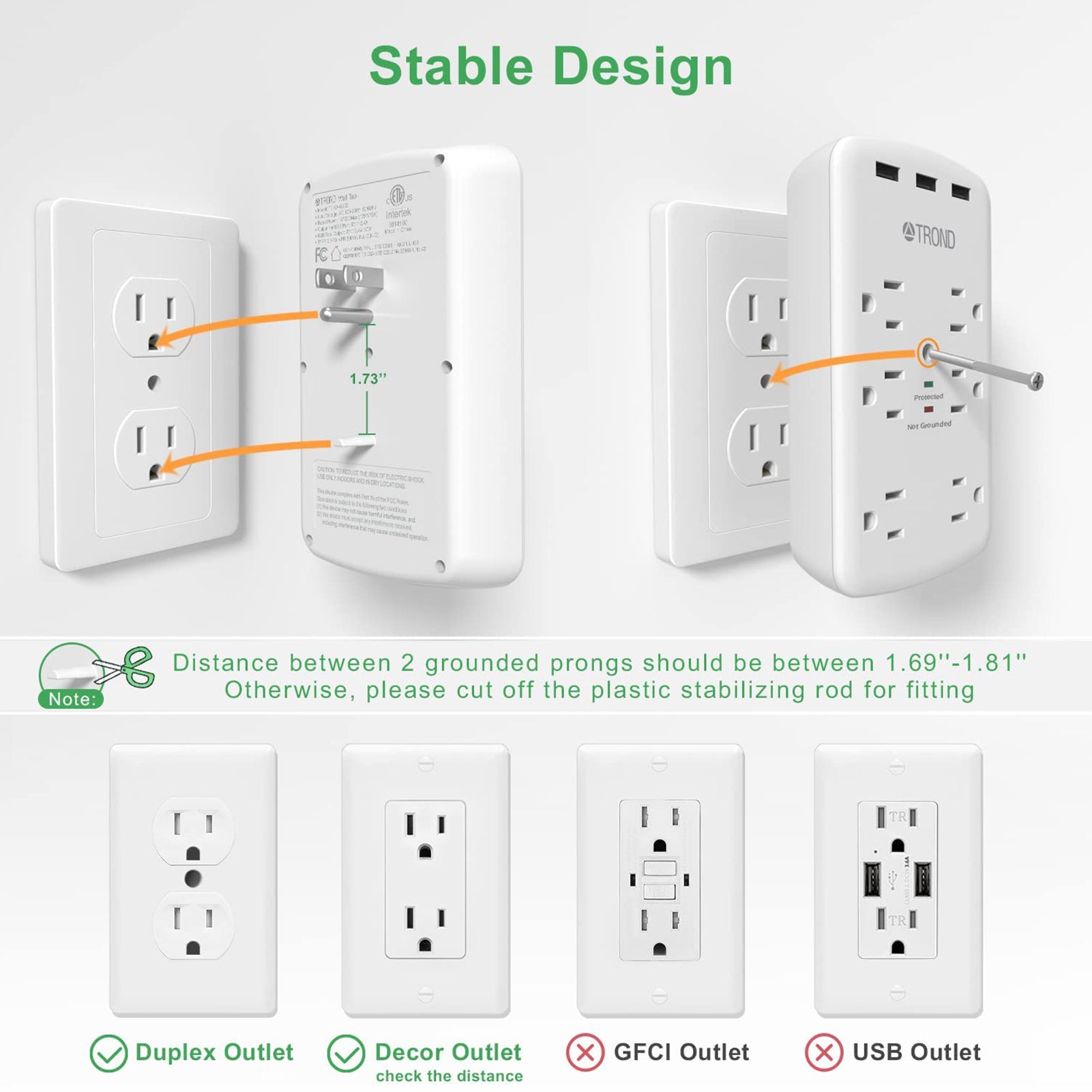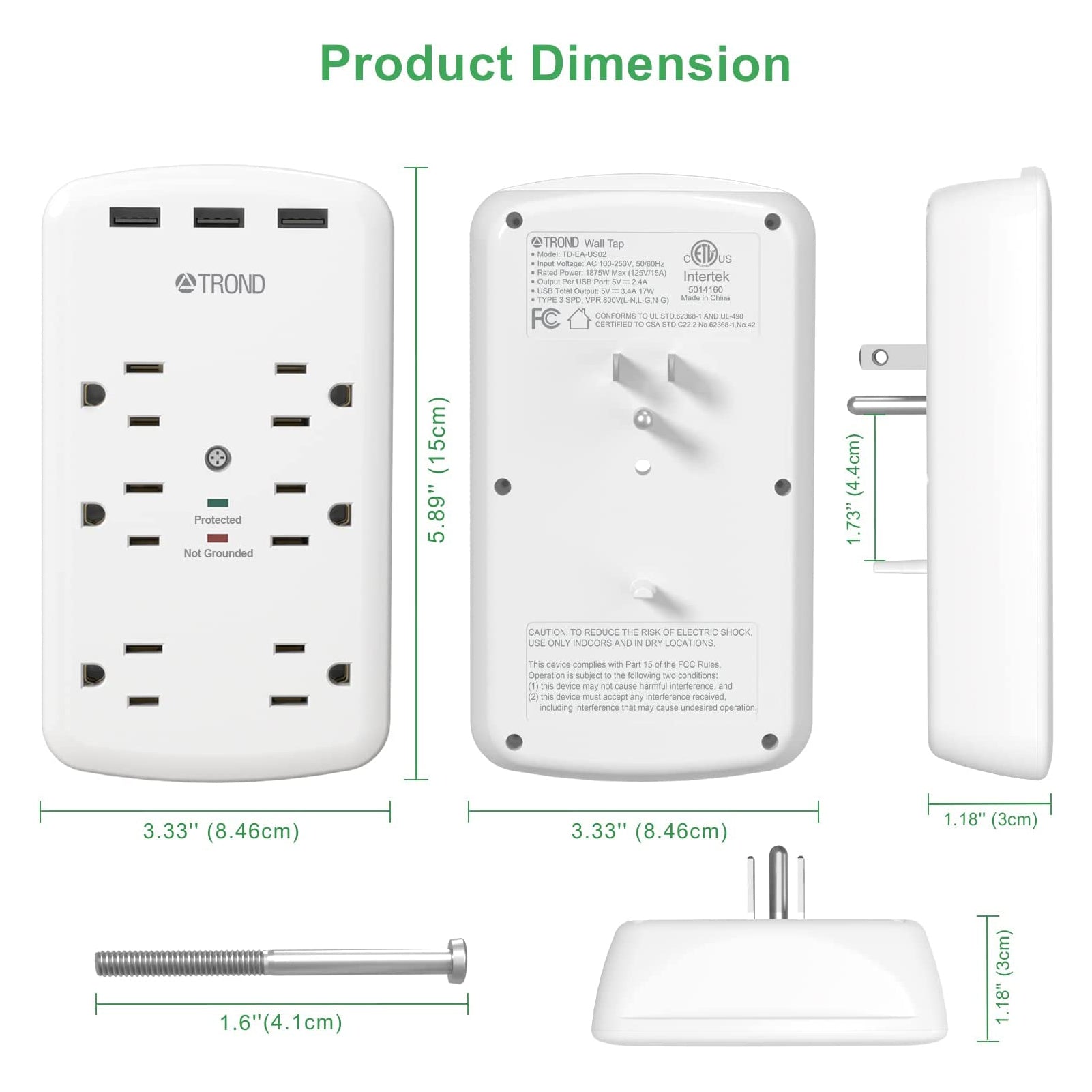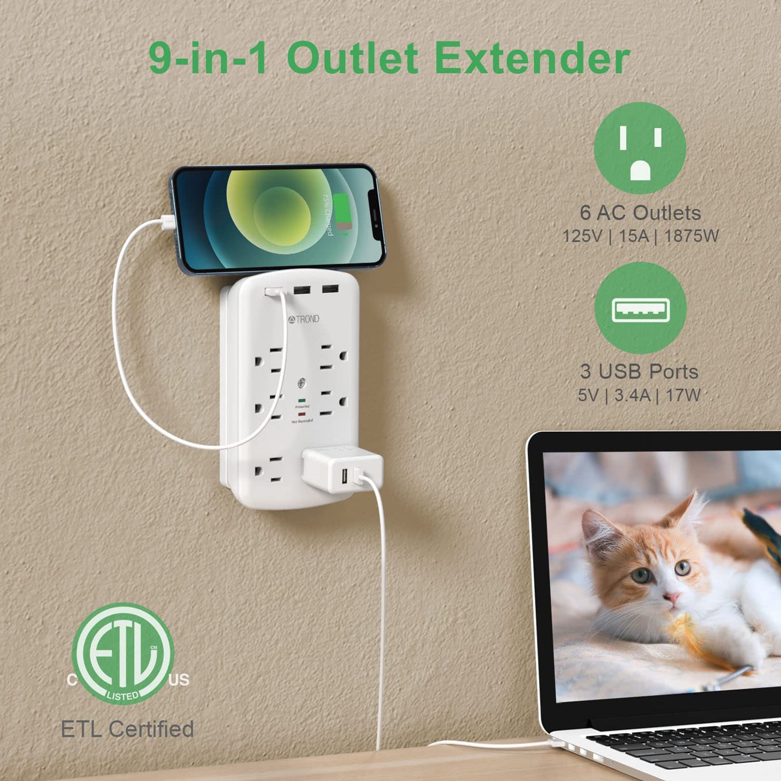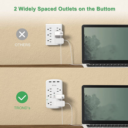 TROND's outlet extender is dedicated to providing the right solutions for charging your Home electronics. Rated to withstand 1280J, this multi plug outlet surge protector offers 6 surge protected outlets and 3 USB plugs; Easily charge 9 devices at once- that's the magic of the TROND's adapter. Say yes to easier phone charging!