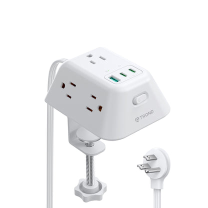 【Desk Clamp Surge Protector】This desk power strip features 5 AC outlets strategically spaced across 3 outward-facing sides. The clever layout allows even bulky power adapters to be plugged in with ease and held securely in place without slipping. Designed for flexible installation, the desk mount power strip comes with a clamp that fits desks or work surfaces up to 1.97" thick