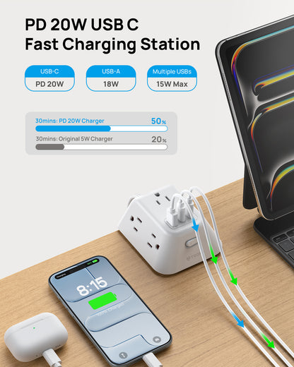【USB C Fast Charging Station】This desktop power strip features two 20W PD fast-charging USB-C ports and one 18W QC fast-charging USB-A port, meeting the charging needs of various devices. Compared to standard USB-C ports, it significantly increases charging speed and effectively reduces charging time for devices, making your daily use more convenient