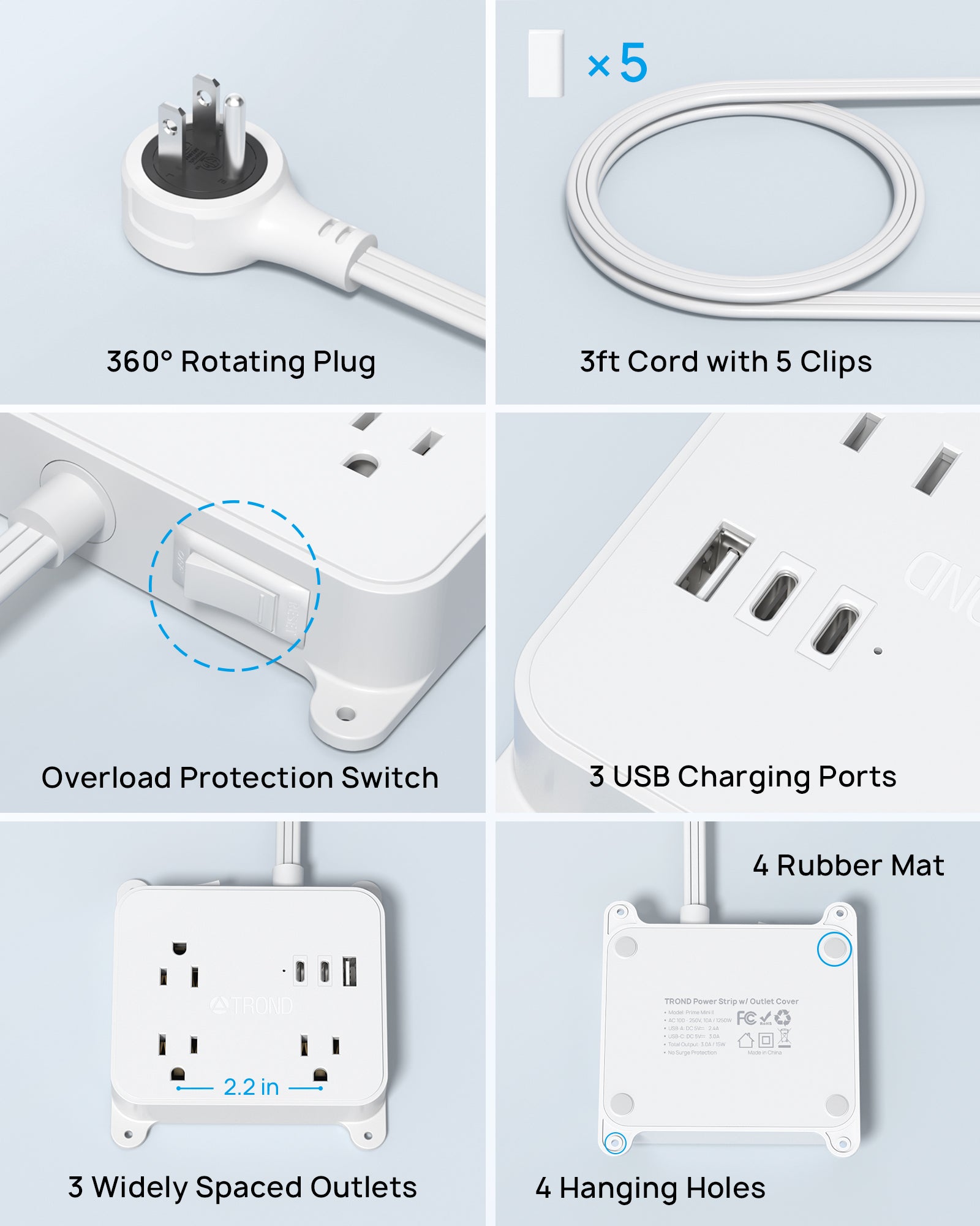 【USB C Charging Station】This usb power strip with 2 USB C (5V/3A) and 1 USB A (5V/2.4A) charging ports, built-in smart charging technology that detects and delivers an ideal input current of a total of 3.0A/15W, 1625W(125V/13A)