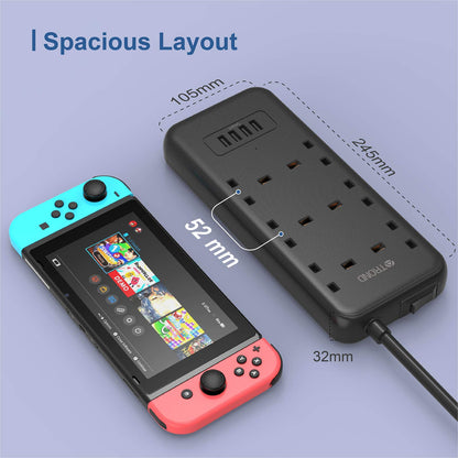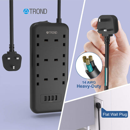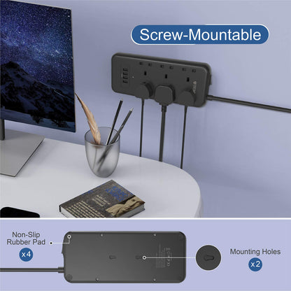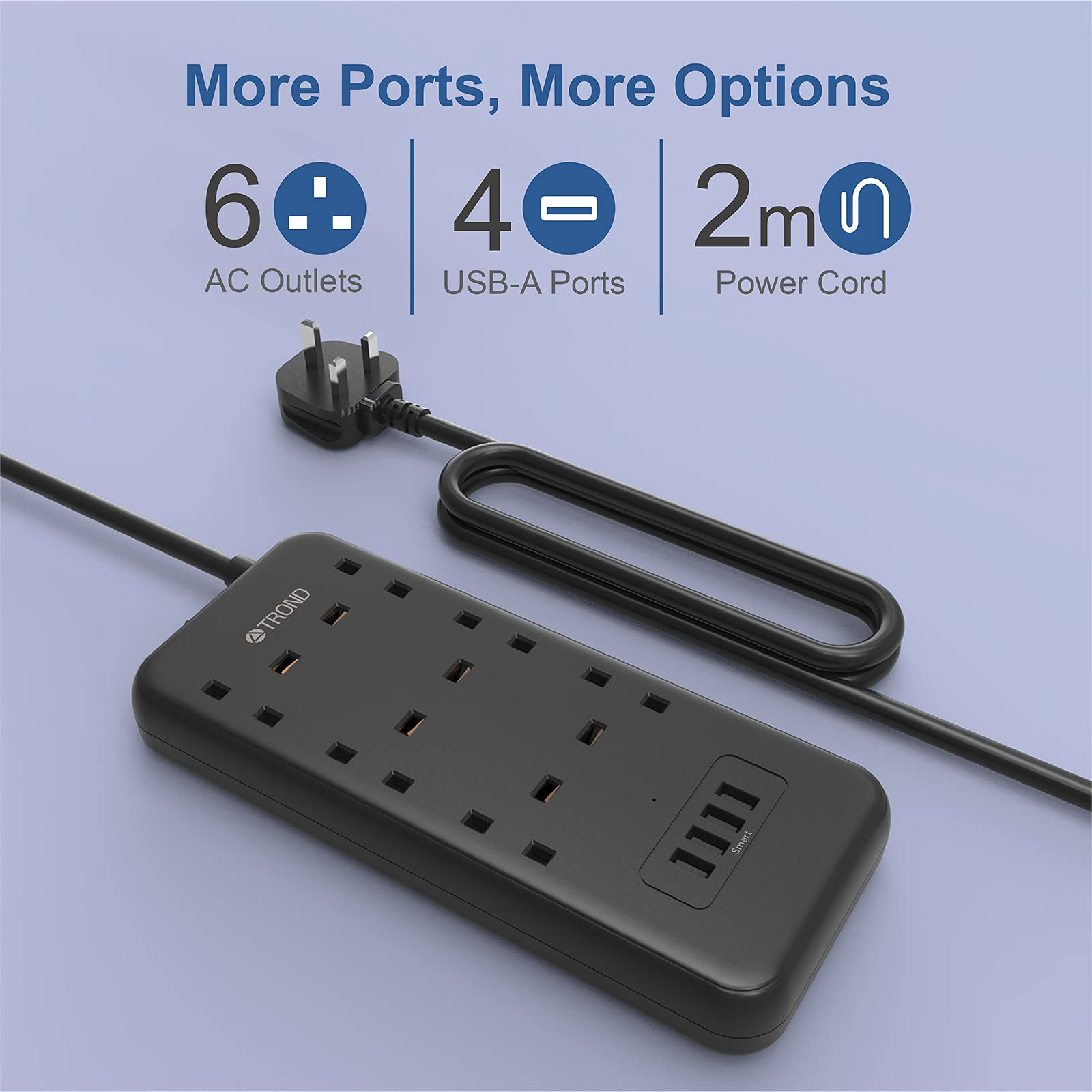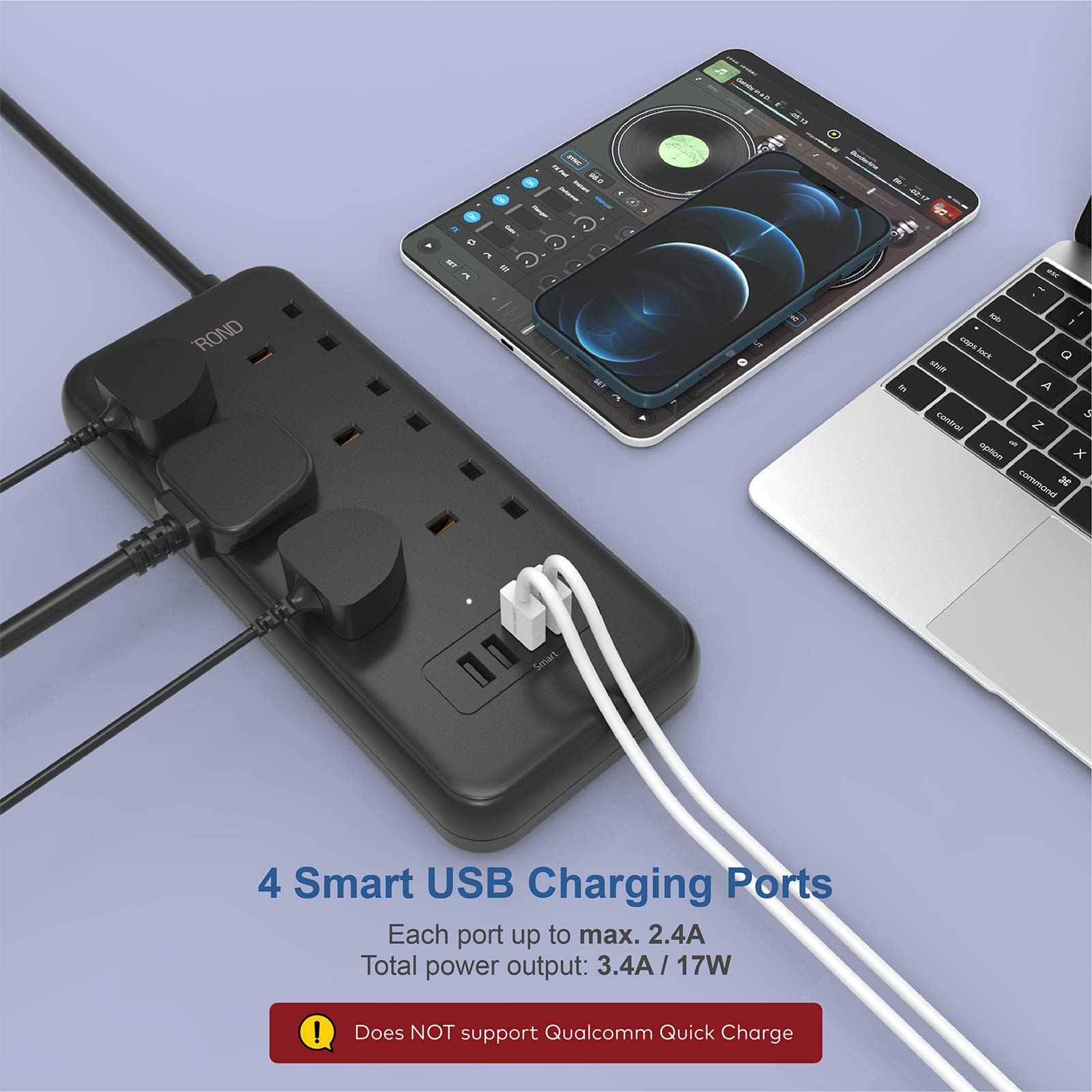 This extension lead features 6 gang power sockets and 4 USB charging slots(3.4A/17W in total), which power up to 10 devices simultaneously and save desktop space for you. Each single USB port can intelligently indentify your device and seeks to maximize its charging speed, each up to 2.4A(3.4A/17W in total) – no need to decide between different ports.