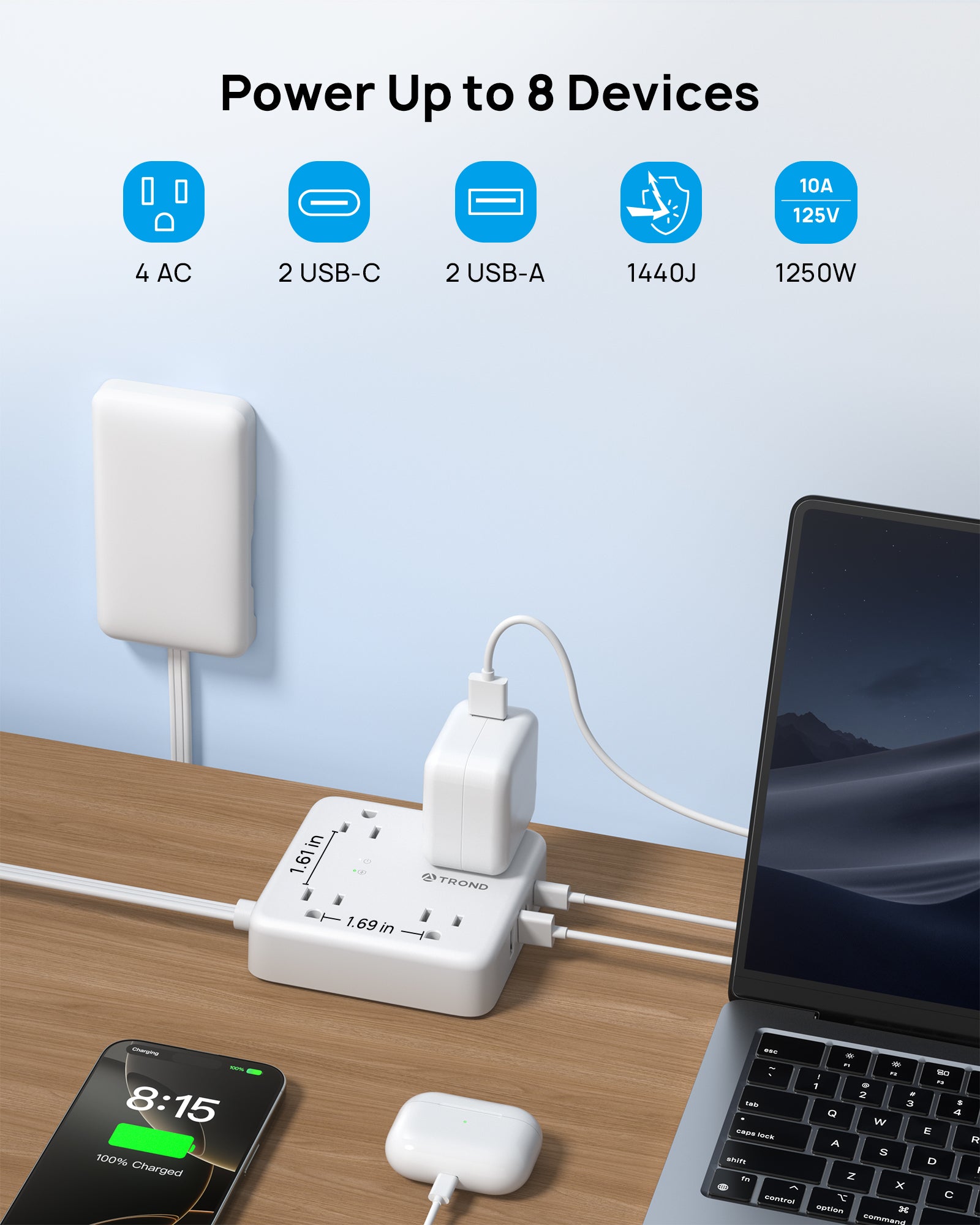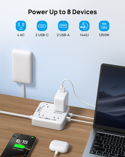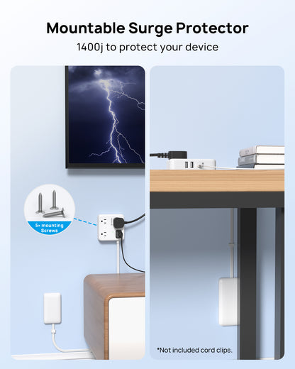 【Reliable Surge Protector Outlet】The flat plug power strip provides 1440J protection for your home office electronics (computers, TV setups, or other valuable electronics) against power disturbances. Made of top-grade UL94 V-0 flame-retardant PC & ABS materials to improve safety and durability. The green LED light indicates protection and a circuit breaker for overload protection