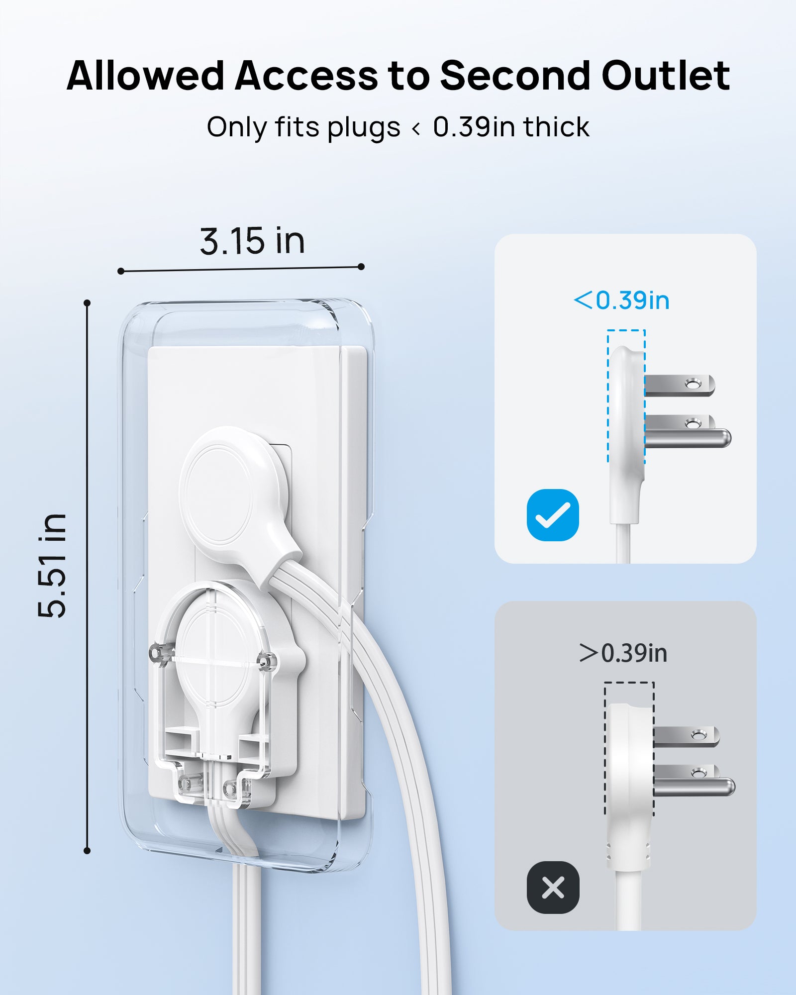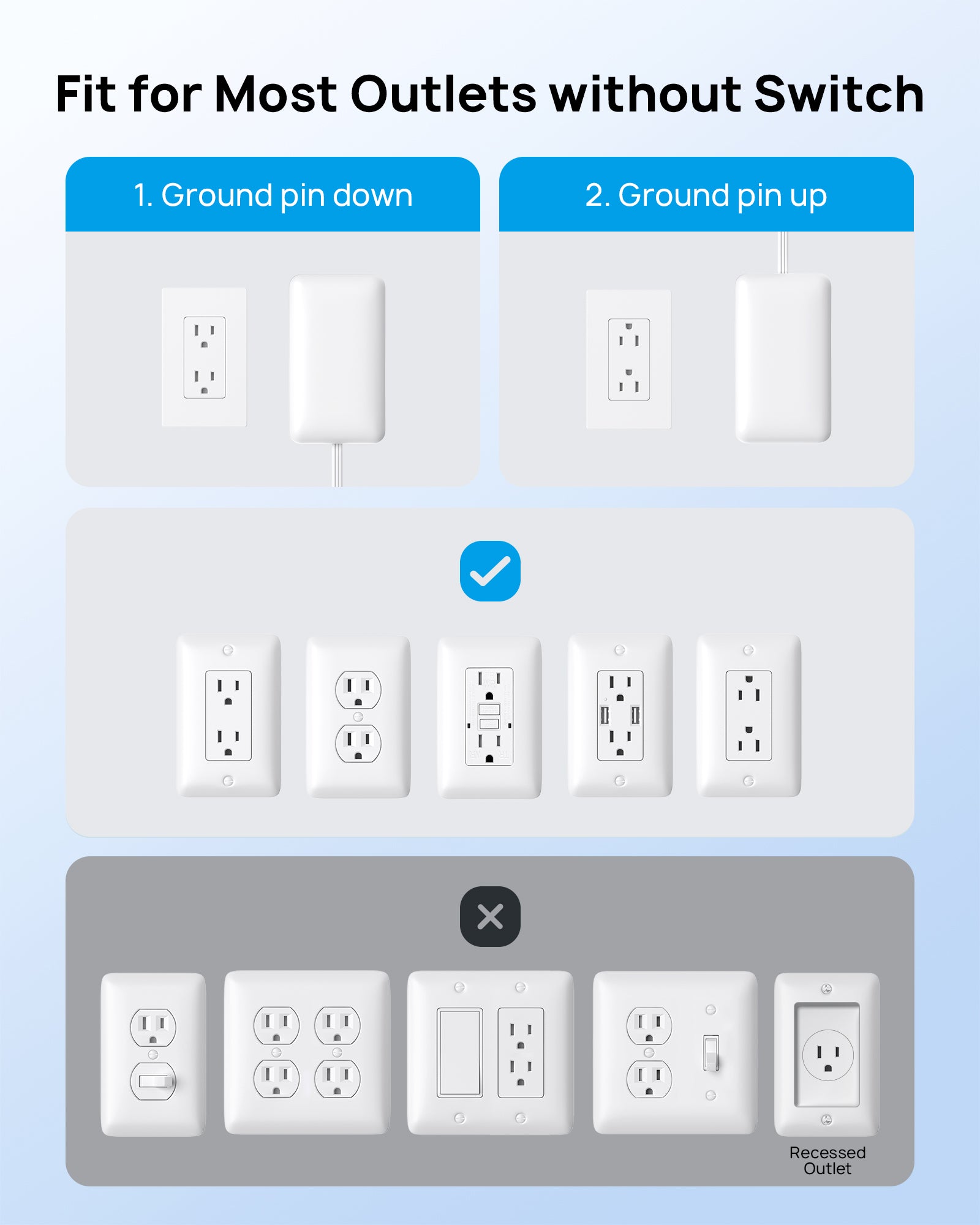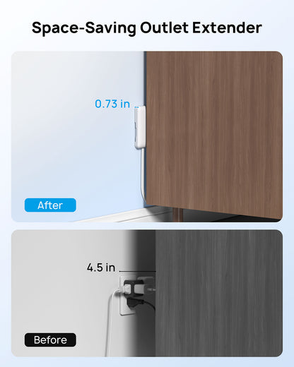【Won’t Waste the Top Outlet】Plug the outlet cover extension cord into the bottom socket of your wall outlet, you will get 4 AC outlets and 4 USB charging ports (2 USB-C ), but still allow a right-angled or left-angled slim plug (only fit plug <0.39" thickness) to access to the original top receptacle. Don't overload the max power rating of 1250W (125V/10A)