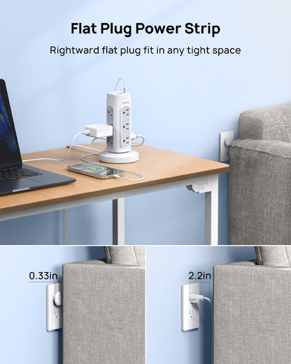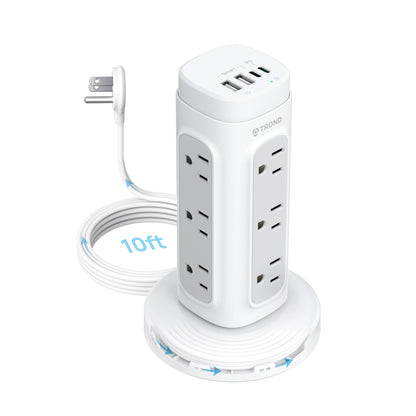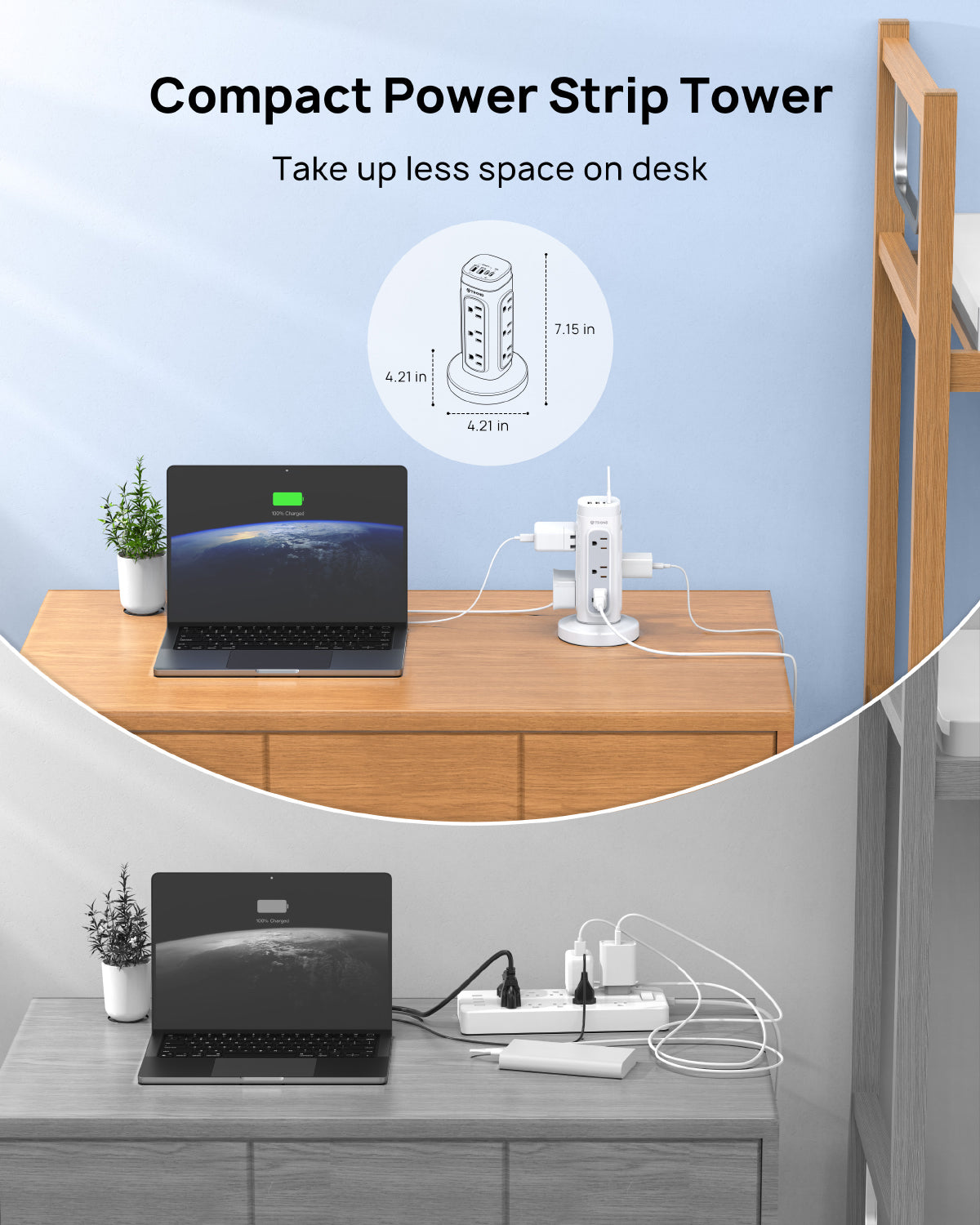 【Small Footprint Rotatble Tower Power Strip】You will like the vertical tower design because it takes up less precious desk surface space but still can power up to 16 devices simultaneously. The tower is also rotatable for easy plug-in. Widely used in indoor places such as office, college dorm room or home.