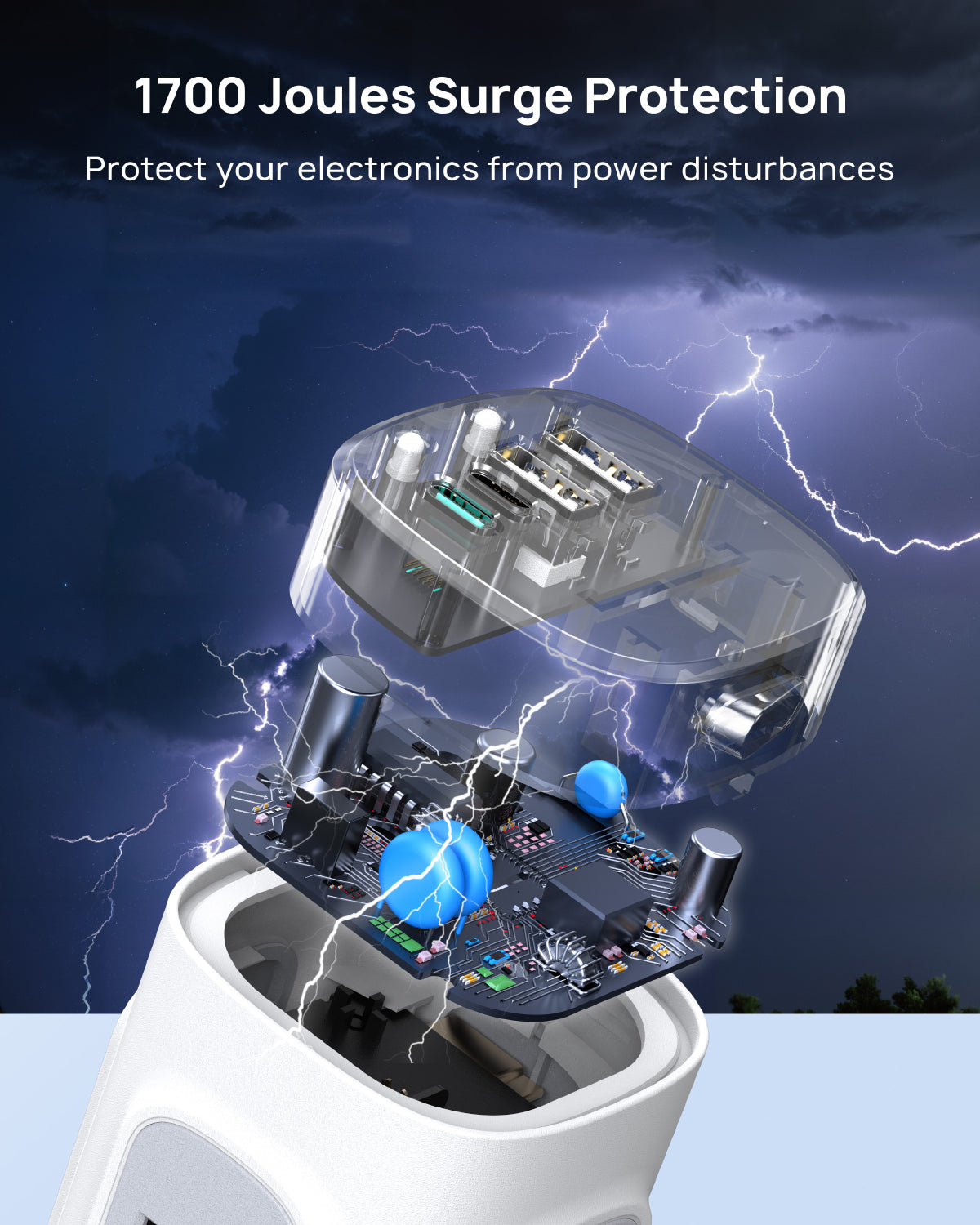 【Safety Assurance Surge Protector Power Strip】Made of the top-grade UL94 V-0 flame-retardant PC & ABS, and featuring 1700 Joules surge protection, overload protection, short-circuit protection, over-current protection, the power strip provides reliable protection for your computers and home/office/college dorm electronics.
