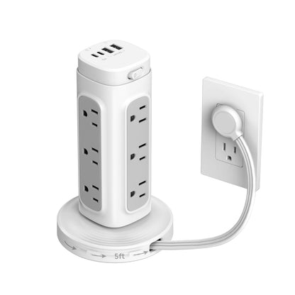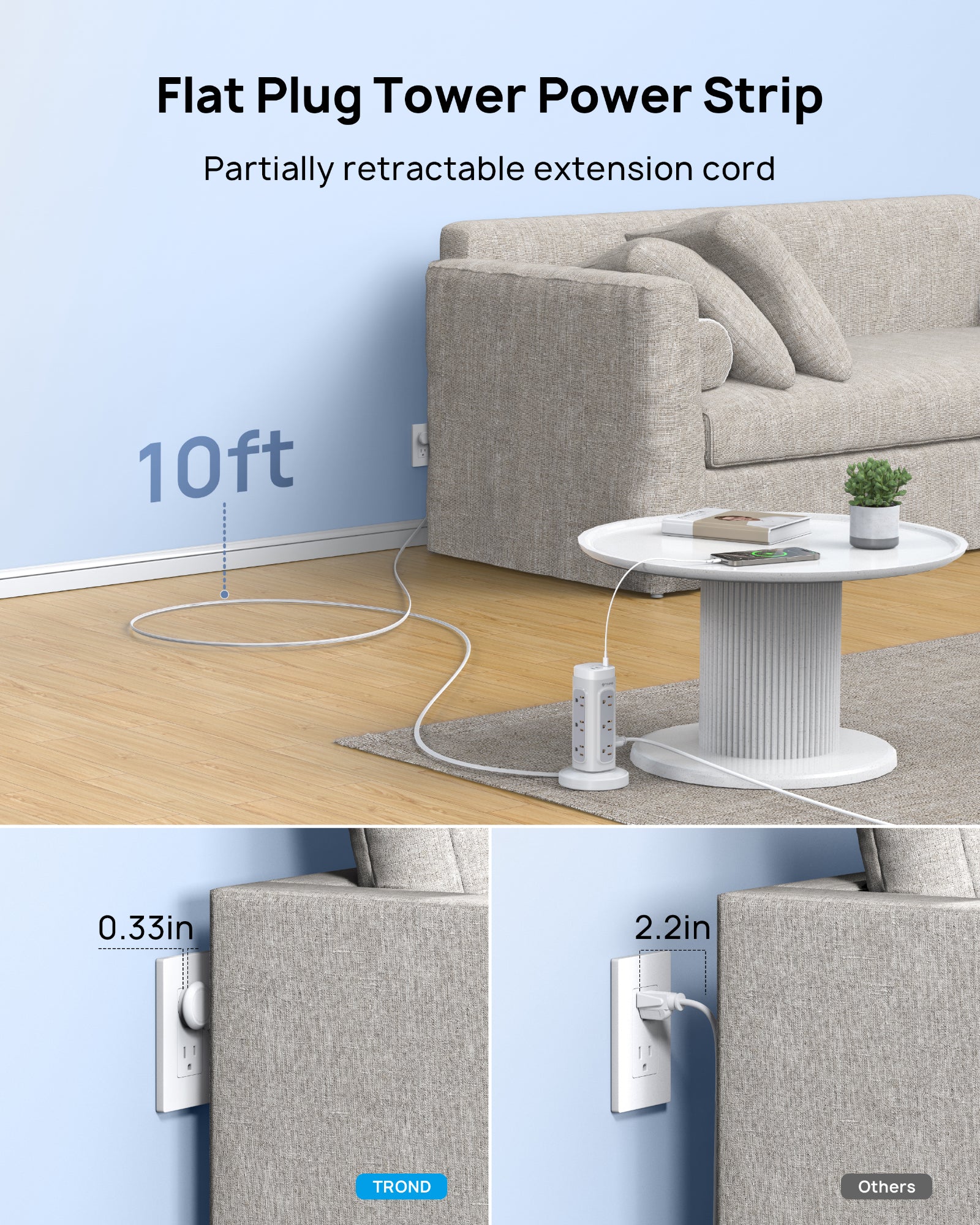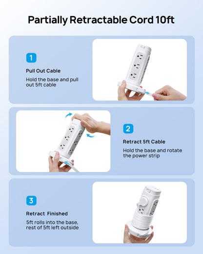 【Retractable Extension Cord for Easy Management】The white power strip features a 5ft retractable flat power cord, allowing you to conveniently adjust the cable length as needed. To say goodbye to tangled cords and maintain a neat workspace, just hold the base and rotate the body of the tower to retract the cord.