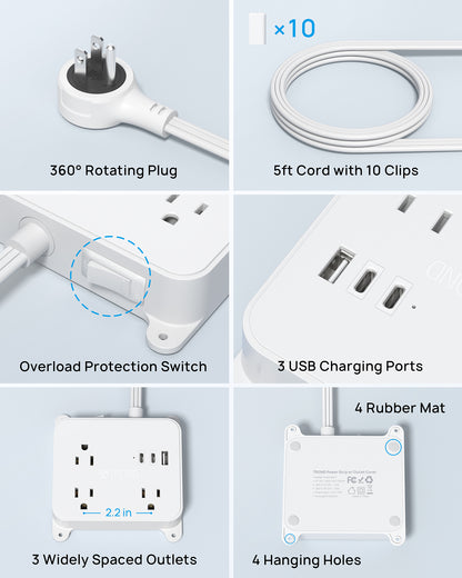 【USB C Charging Station】This usb power strip with 2 USB C (5V/3A) and 1 USB A (5V/2.4A) charging ports, built-in smart charging technology that detects and delivers an ideal input current of a total of 3.0A/15W, 1625W(125V/13A)