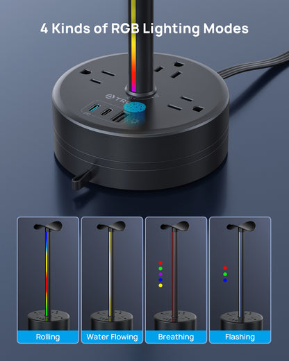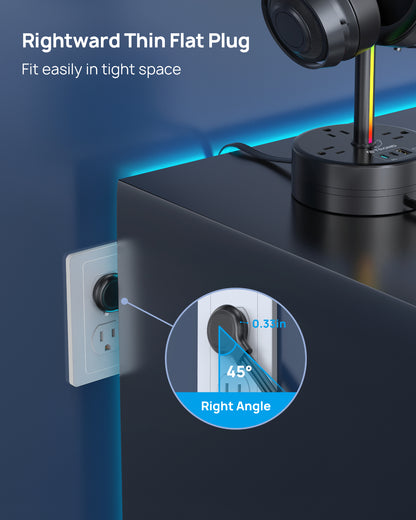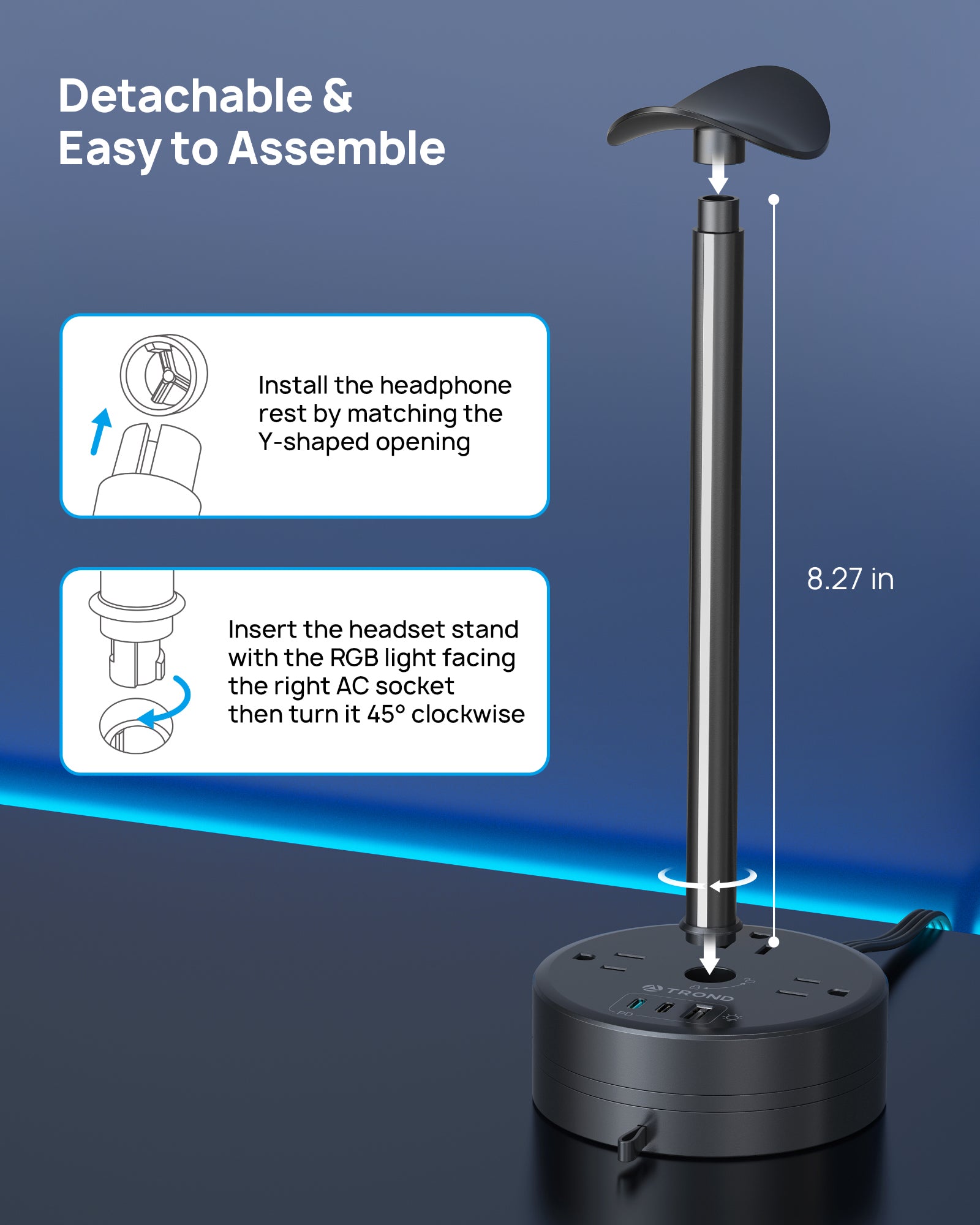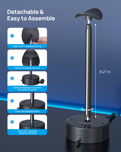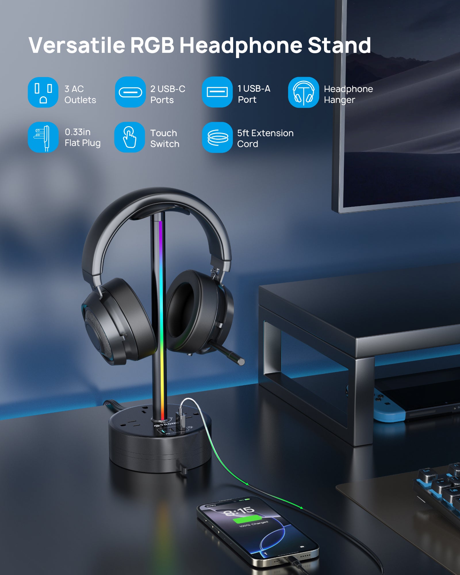 【Gaming Desk Accessories】With built-in 3 AC outlets, 2 USB C ports, 1 USB-A port and wireless headphone hanger, this headphone stand is a multi-functional and stylish desk accessory and space organizer. Satisfying your charging needs, storing your headphones properly, and keeping your gaming stuff and desk clean and tidy