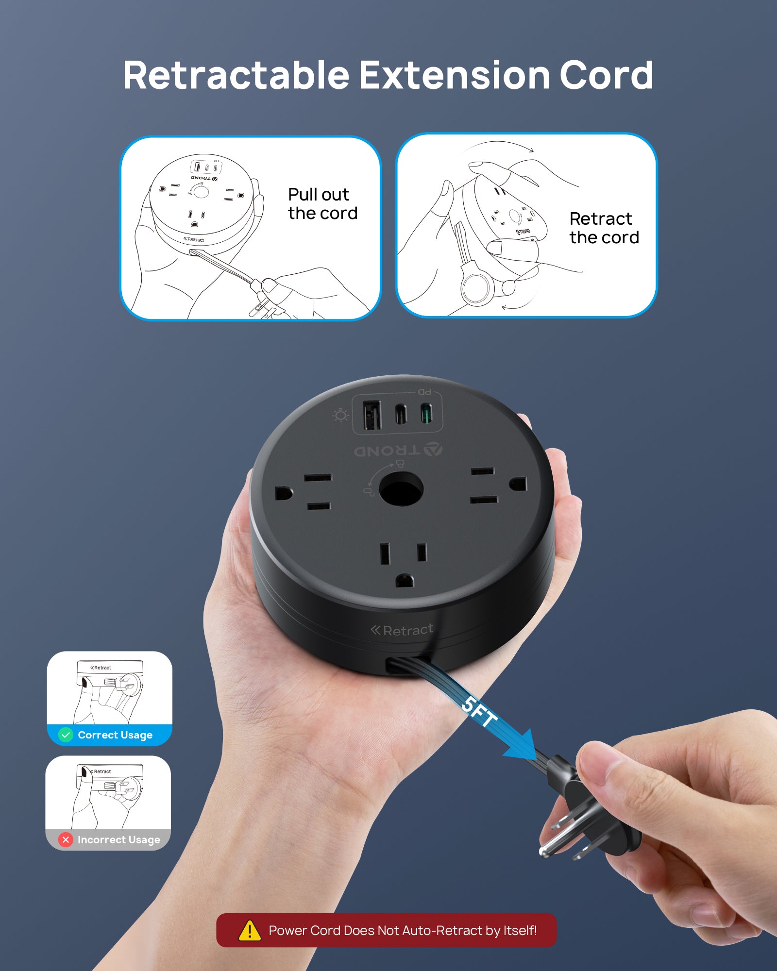 【Retractable Flat Power Cord 】The 5ft flat extension cord is retractable which keeps the cord from becoming an ungainly mess while still giving it a nice reach. You can pull out and retract the cord according to your desired length. The 0.33-inch thin plug is so flat that it can easily fit in tight spaces and hide behind the gaming desk or other furniture