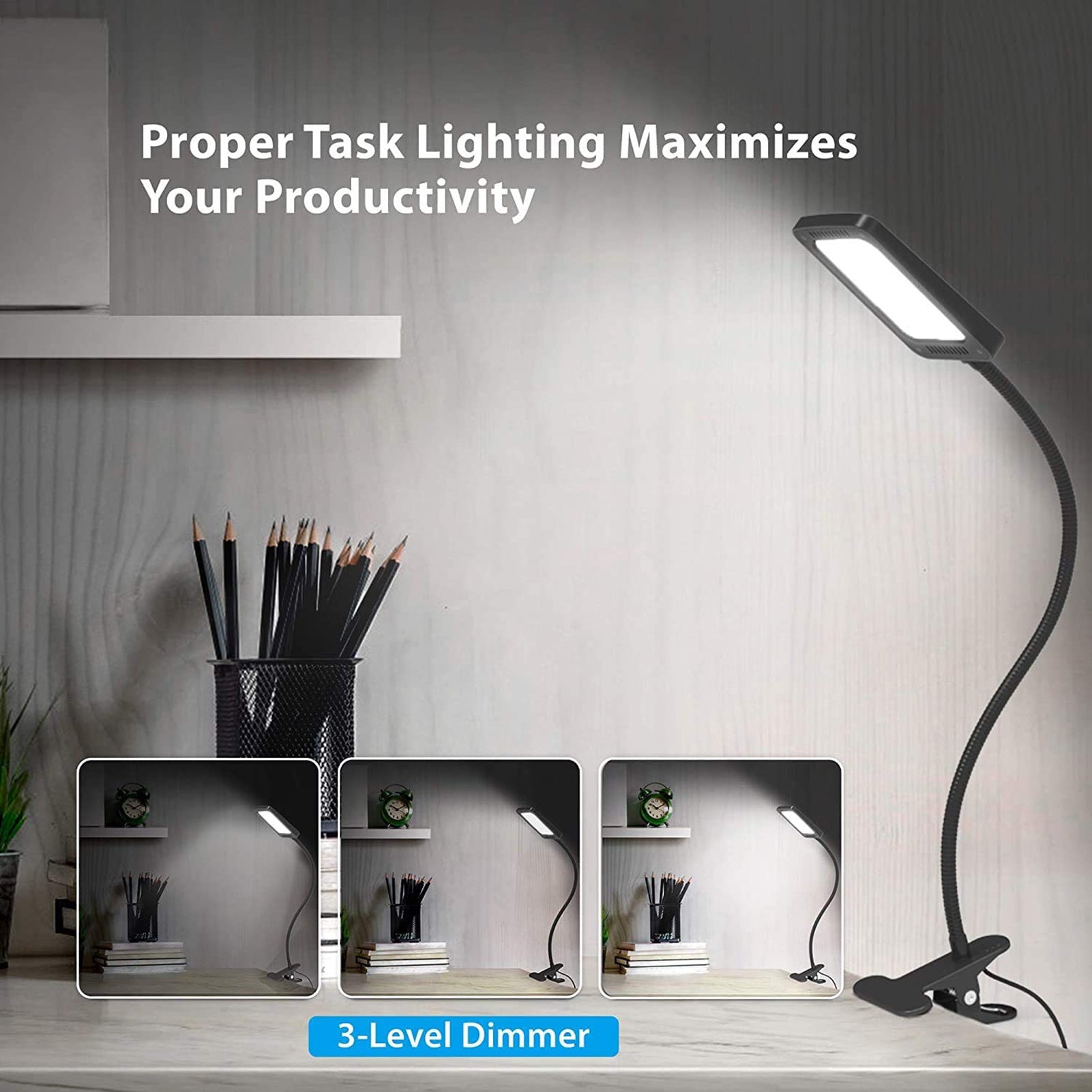 3. Clamp light with long gooseneck. Strong aluminum clamp opens up to 1.65” width (optimal 0.6”-1.38” width) and can be used perfectly with headboard, workbench, computer desk, easel, drafting table, or sewing table. Extra-long flexible gooseneck (50cm/19.7” if fully extended) of bright clamp light allows you to adjust your led clamp desk lamp with ease and to direct the light wherever you want.