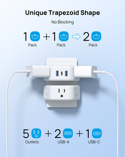 【Multiple Plug Outlet】This 2-pack of wall outlet extender offers versatile charging capabilities. One unit features 2 AC outlets, 1 USB-C port, and 2 USB-A ports, and the other provides 3 AC outlets. Two different units can be used according to your needs, perfect for the bedroom, bathroom, kitchen, hotel, and college dorm room, etc