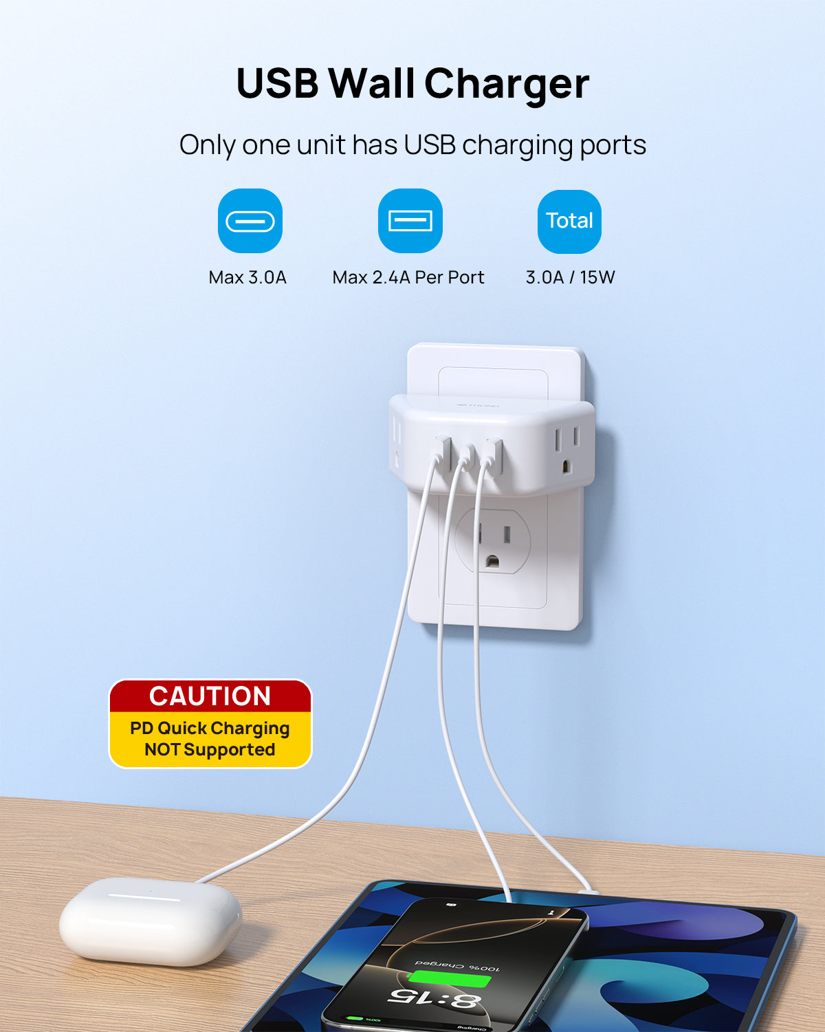 【Unique Shape and No Blocking】This plug extender features an intelligent three-sided layout, the AC outlets or USB ports are placed on three different sides, which allows multiple power adapters or USB charging cables to be plugged in simultaneously without blocking each other, ensuring hassle-free use