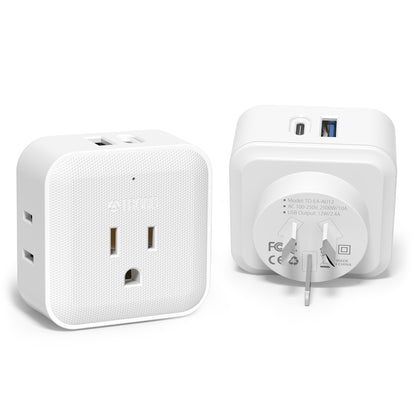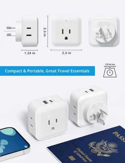 2. 6 in 1 travel adapter for Australia.This electrical plug adapter quickly expands a single Type i outlet to 4 USA sockets, with additional 2 USB slots, both USB A and USB C are built in, so you can charge nearly any device, new or legacy in one place. International travel must haves.