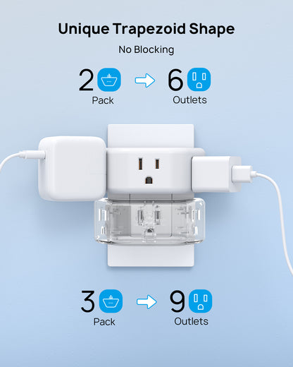 【Unique Shape & No Blocking】The shape of the wall outlet adapter is a trapezoid shape, like a piece of cheese. The AC sockets are placed on three different sides, can accept 3 bulky plugs at once without blocking each other, and the power consumption is flexible and convenient.