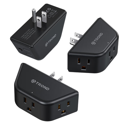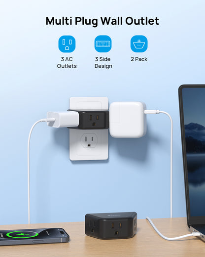 【Simple and Practical】The multi plug wall outlet features a trapezoidal shape with AC sockets positioned on three different sides. This angled outlet splitter is designed to accommodate devices with large chargers or irregularly shaped plugs, without any obstructions or interference.