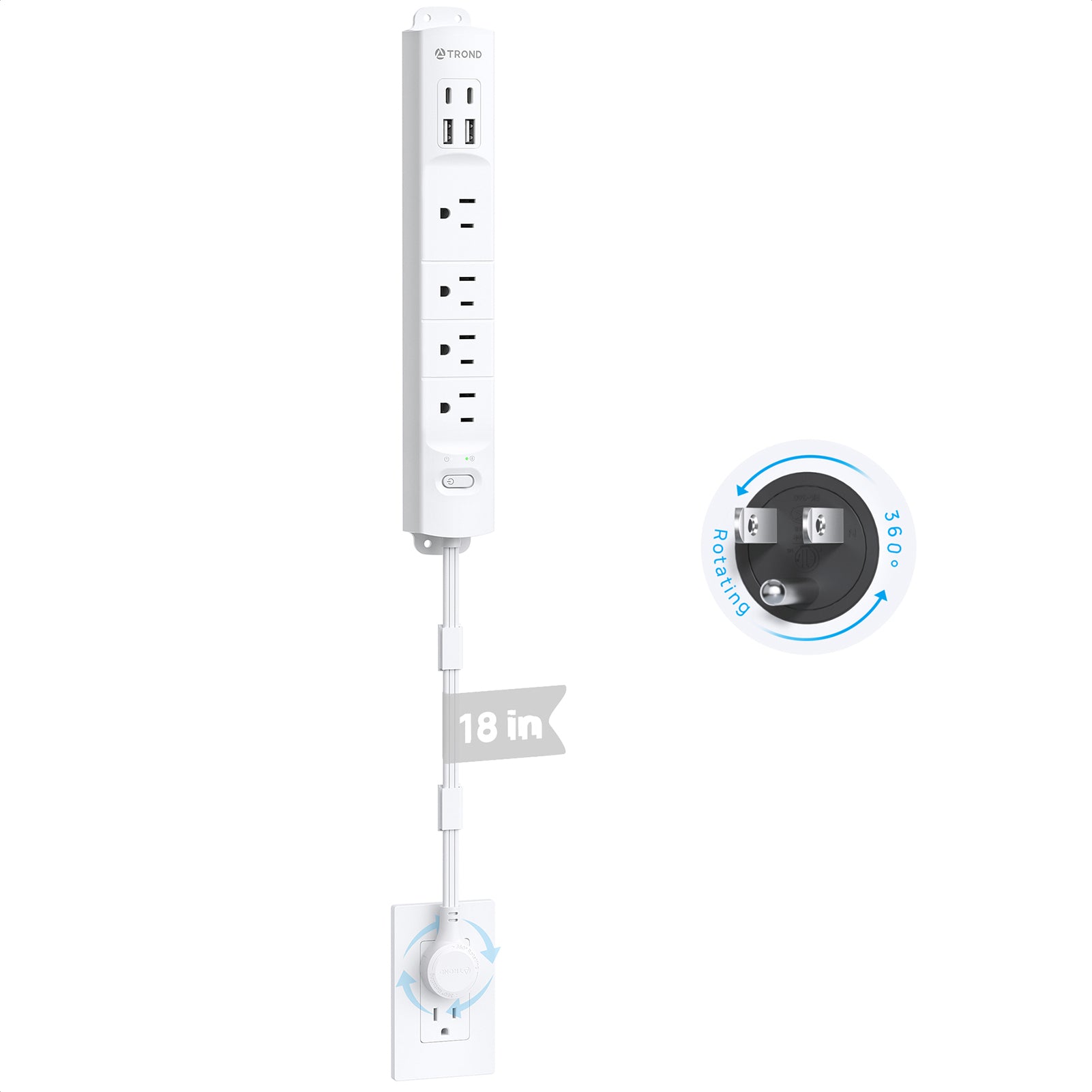 【360° Rotating Flat Plug Outlet Extender】The 360-degree rotating flat plug (US Patent No. 11901685) allows you to adjust its angle freely, fit for various wall outlets, 36 in Flexible extension cord fixed to the wall with cable clips(3 clips included), making it ideal for use behind TV cabinets, nightstands, or desks