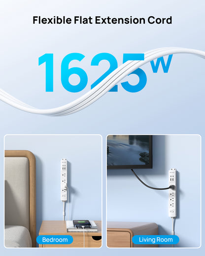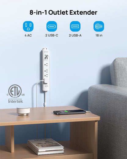 【8-in-1 Outlet Extender】This electrical outlet extender offers 4 wide AC outlets and 4 USB ports (2 USB-C). It can charge 8 devices simultaneously without blocking. The extendable outlet with 4 AC outlets (1625W max). It is perfect for powering phones, laptops, and appliances in home offices, bedrooms, or laundry rooms