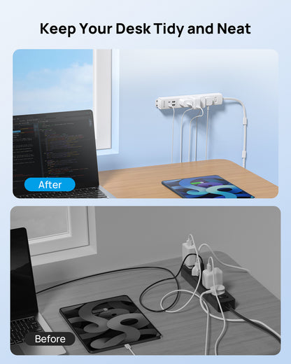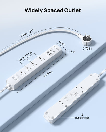 【Surge Protector with USB Ports】It features 4 USB ports with a total output of 5V/3.4A/17W: each USB-A port provides up to 5V/2.4A, while the USB-C port delivers 5V/3A. 1440 joules of surge protection with a safety switch and 2 LED indicators (white for power, green for Protected)