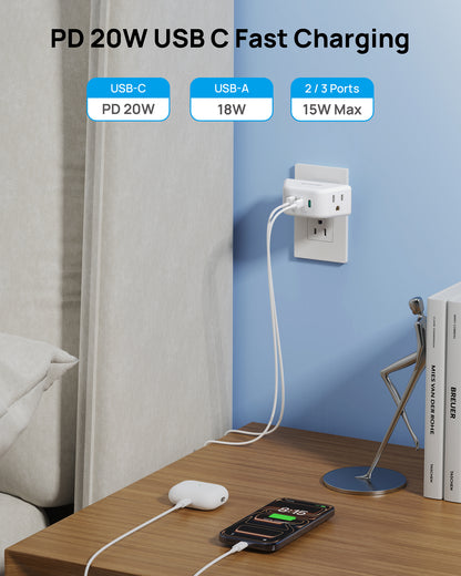 【PD 20W USB Plug Extender】This outlet adapter features 2 PD 20W USB C and 1 QC 18W USB A, using a single USB C provides PD 20W Max, using a single USB A provides QC 18W Max, and using two or three USB ports provides 15W Max. Enjoy fast, efficient charging for your USB devices