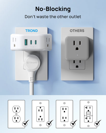 【360° Rotating Plug for Easy Use in Any Space】This wall outlet adapter features a 360° rotating plug, allowing you to easily adjust the angle to fit into tight spaces. It's the perfect solution for bathroom, kitchen, and bedroom setups. Compatible with both horizontal and vertical receptacles, it provides excellent flexibility and convenience