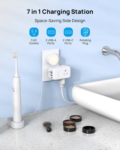 【7-in-1 Outlet Adapter】Transform a single socket into 3 way outlets and 4 USB ports (2 USB-C), enabling you tocharge up to 7 devices at once. Perfect for travel, home, office, and dorm rooms, it meets all your charging demands efficiently.