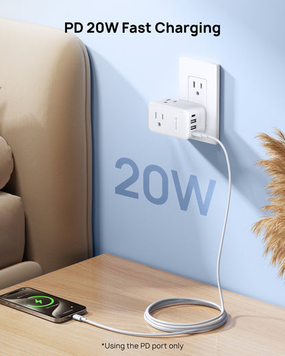 【PD 20W USB Outlet】With 2 USB-C and 2 USB-A ports, this plug extender offers 12W output for each USB-A port, 15W for one of USB-C port, and PD 20W for the other USB-C ports combined. Enjoy fast, efficient charging for your phone andother USB devices.