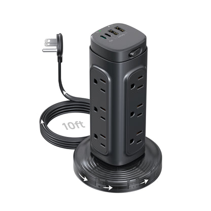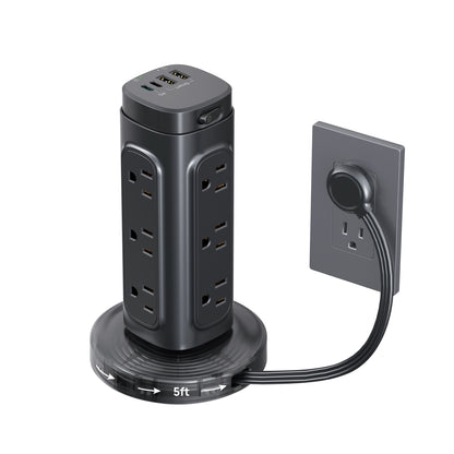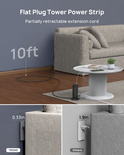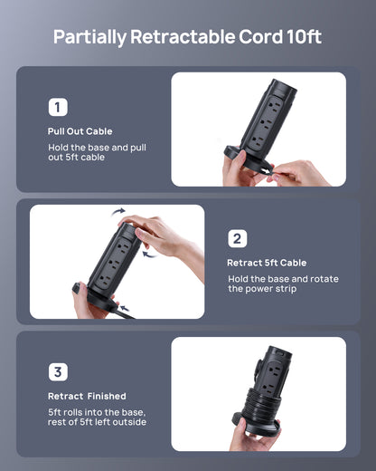 【Semi-retractable Power Strip Tower】The black power strip surge protector features a 10ft flat power cord, allowing you to adjust the cable length as needed. Black blends perfectly with dark decor Note: Only 5ft of the power cable can be retracted and the rest 5ft will always left outside.