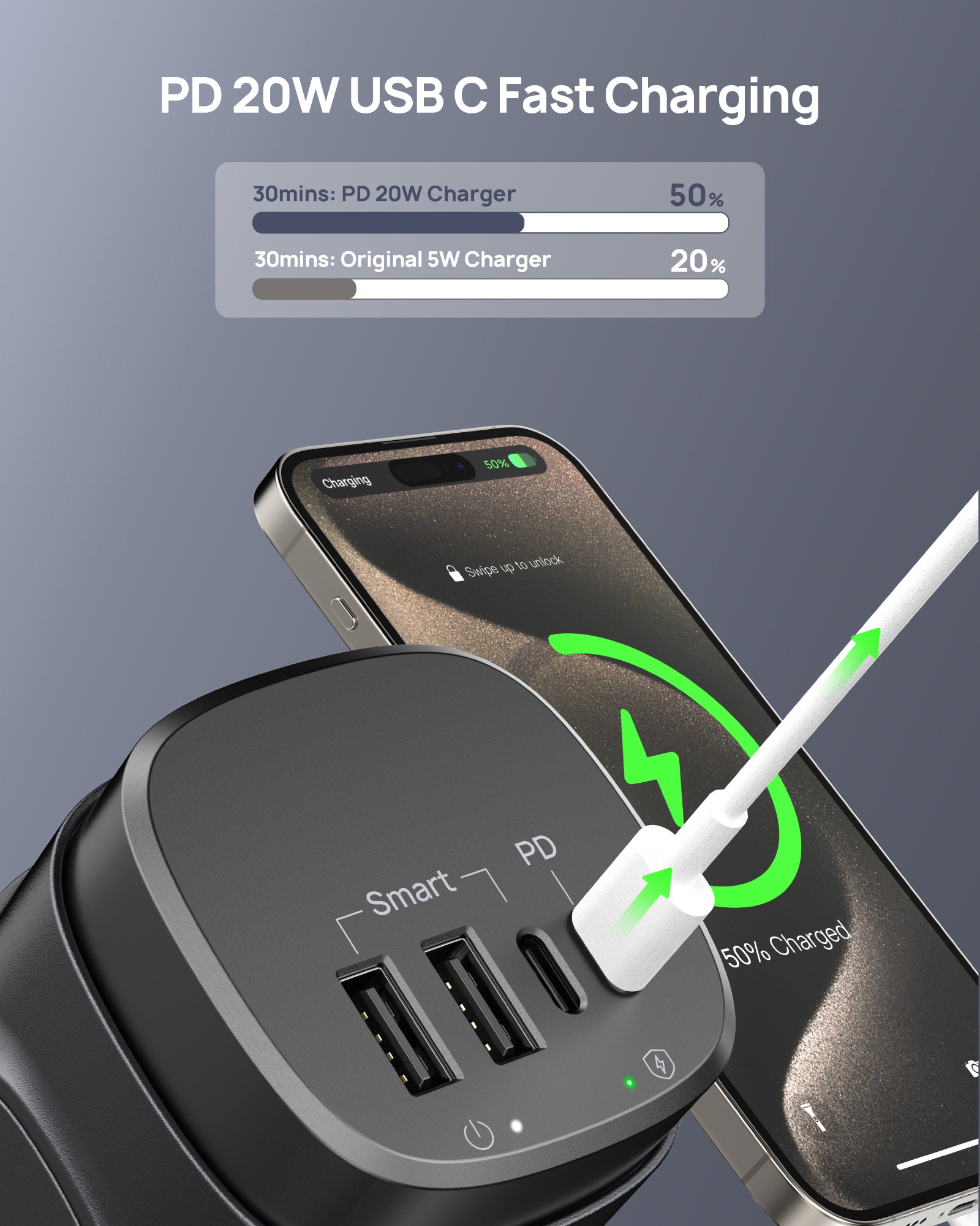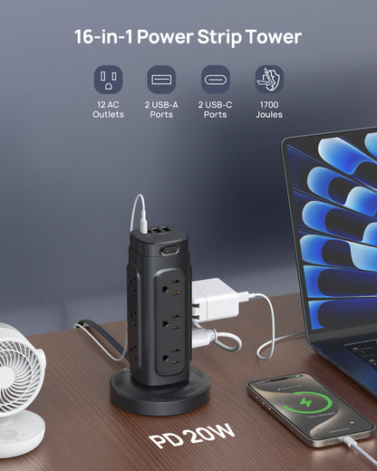 【20W USB C Power Strip Tower 】The USB power strip offers 12 widely-spaced AC sockets (1.5 in distance), 2 USB-A and 2 USB-C ports. Ideal for your home, office, college dorm room, or guest room. Note: The green USB C port offers PD 20W quick charging. Any 2/3/4 USB outputs shared 15W.