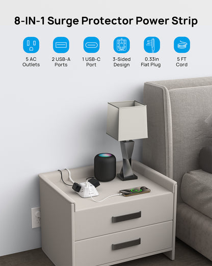 【8-IN-1 Surge protector power strip】The extension cord with multiple outlets has 5 AC outlets, 2 USB-A Ports, and 1 USB-C Port, which allows you to power up to 8 devices simultaneously, perfect charging for your laptops, tablets, phones, and gaming devices. Perfect choice for home, office, dorm room, or travel. Max. power: 1250W (125V~10A).