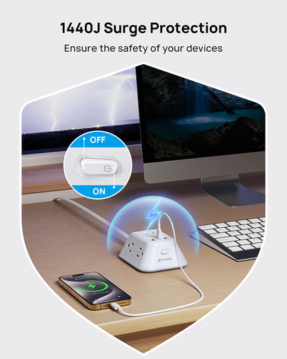 【1 USB-C Port & 2 USB-A Ports】The power strip with usb ports features 2 USB-A ports and 1 USB-C port. Each USB A port features 5V/2.4A Max output, and the USB C charging port features 5V/3A MAX. Total 5V/3.4A output, automatically detect charging devices and deliver optimal charging speed, compatible with most USB devices.