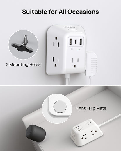 【Wall Mount & On/Off Switch】With 2 mounting-holes on the back side, you can secure this white extension cord on different applications. The 4 anti-slip rubber bottoms make it stable on your desktop or nightstand without slipping off. And the On/Off switch is convenient for you to save power when this usb power strip is not in use, as well as protect your devices when overloading.