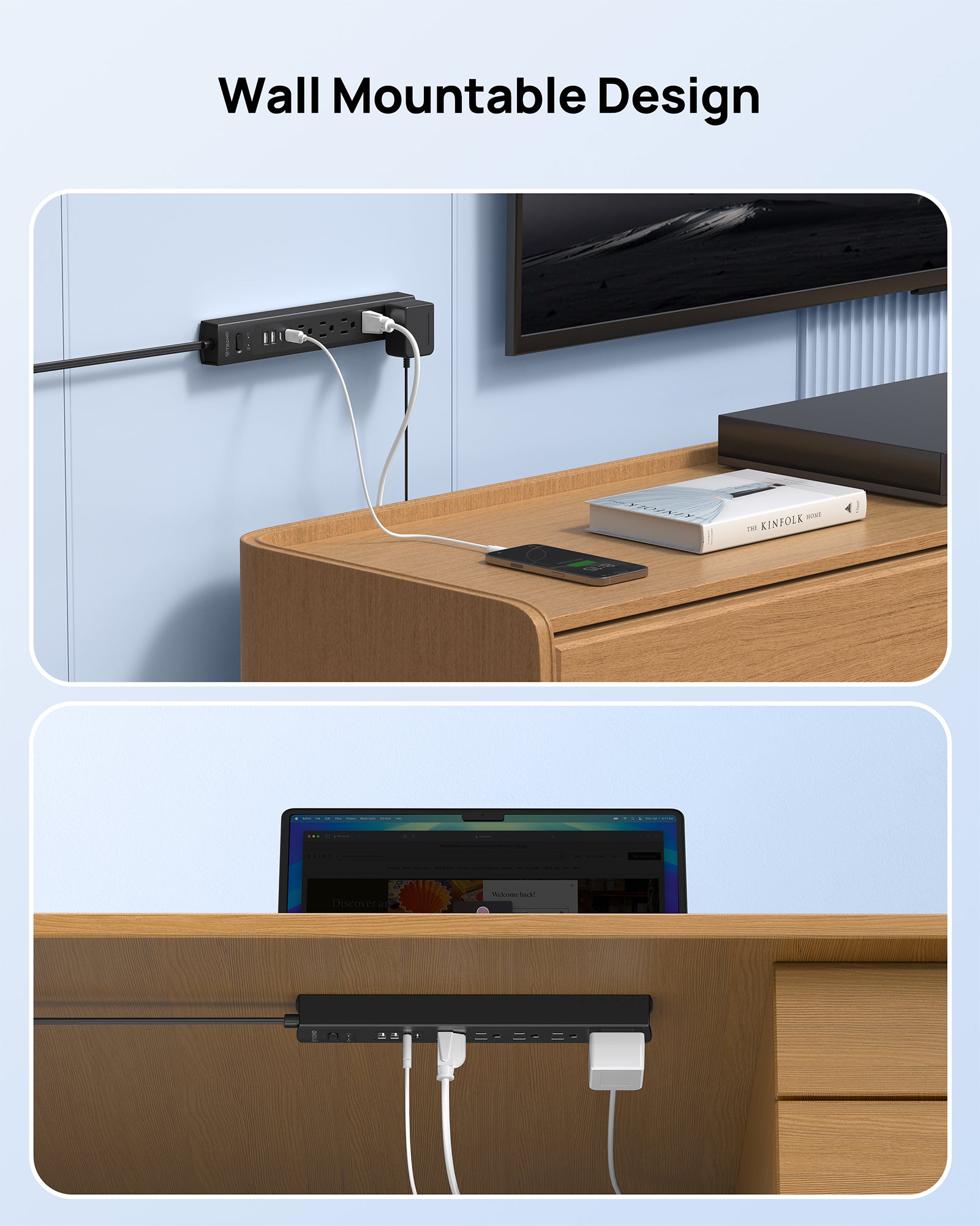 【Wall Mountable Design】With screw fixation design on both end allow this mountable power strip securely installed in various applications, this wall mount surge protector can also be used as a desktop power strip or nightstand USB charging station without slipping off