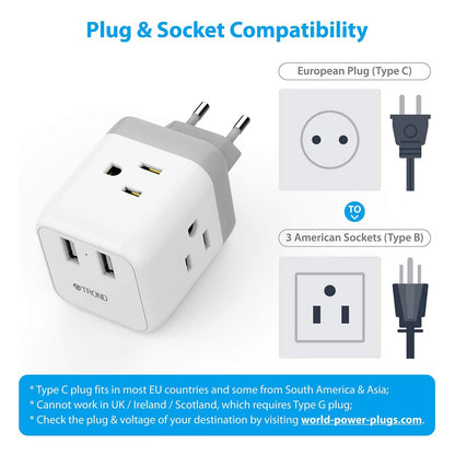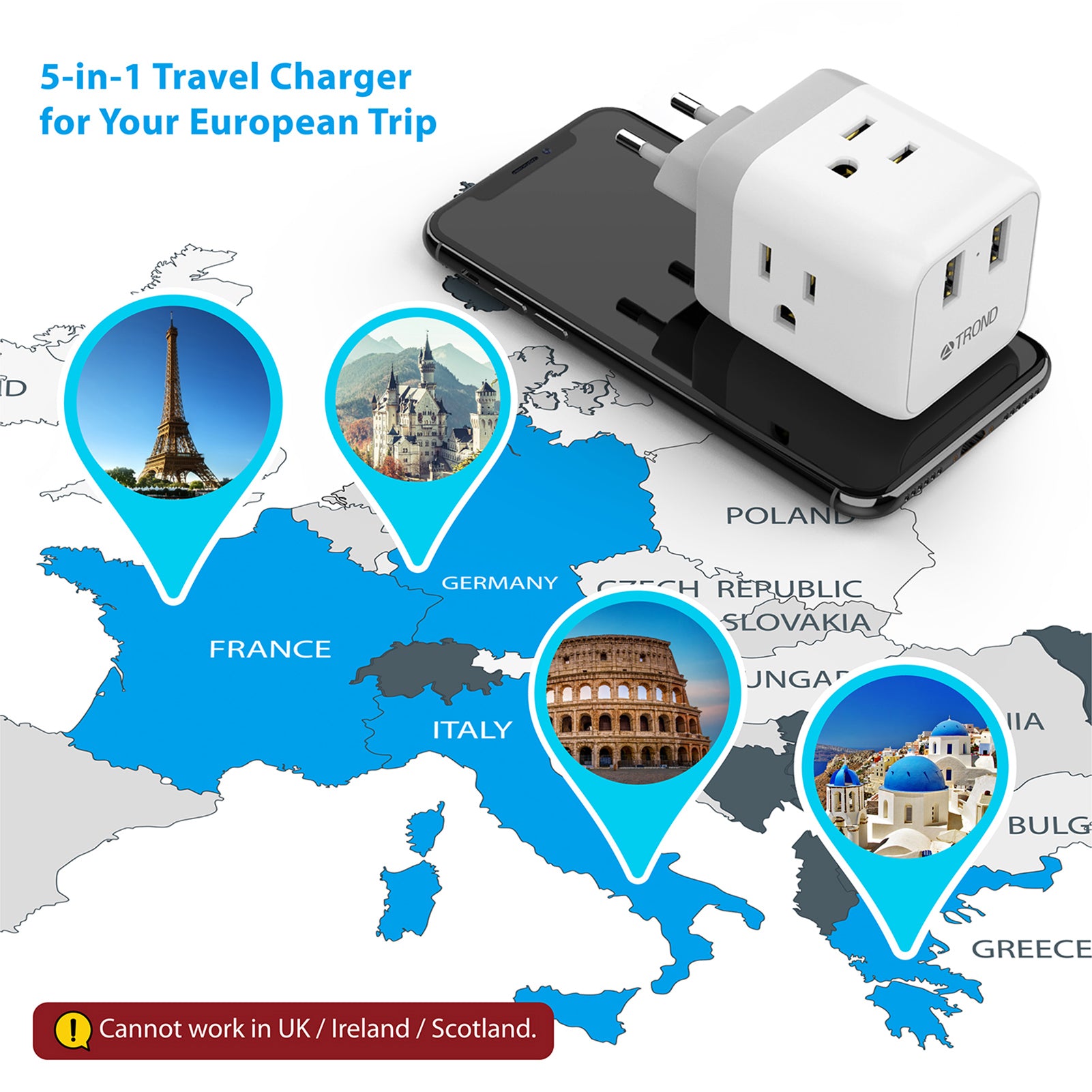 2. 5-in-1 EU power adapter. It turns one European socket (Type C) into three standard 3-prong American outlets PLUS two USB charging ports (2.4A total output, Quick Charge NOT supported), which can easily charge your laptop, cell phone and tablet while traveling in most EU countries
