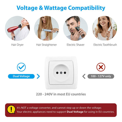 2) Your electric appliances, such as hair dryer, straightener or electric razor, need to support Dual Voltage (100V-240V) for using in EU countries; otherwise, you will need a voltage converter;