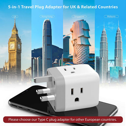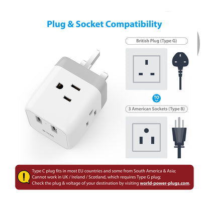 1. UK to USA plug adapter. Type G plug is compatible in United Kingdom and some related countries, such as Ireland, Hong Kong, Macau, Malta, Malaysia, Oman, Singapore, Saudi Arabia, UAE, Yemen and more (Note: you will need our Type C plug adapter when visiting other European countries)