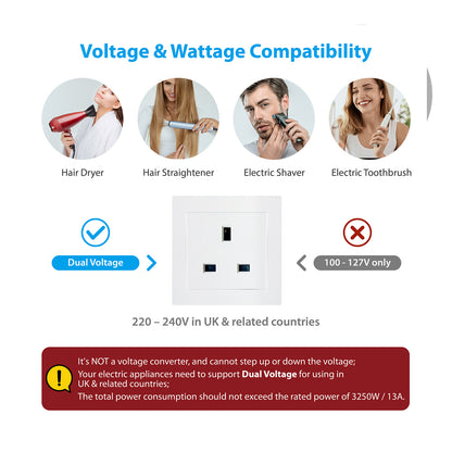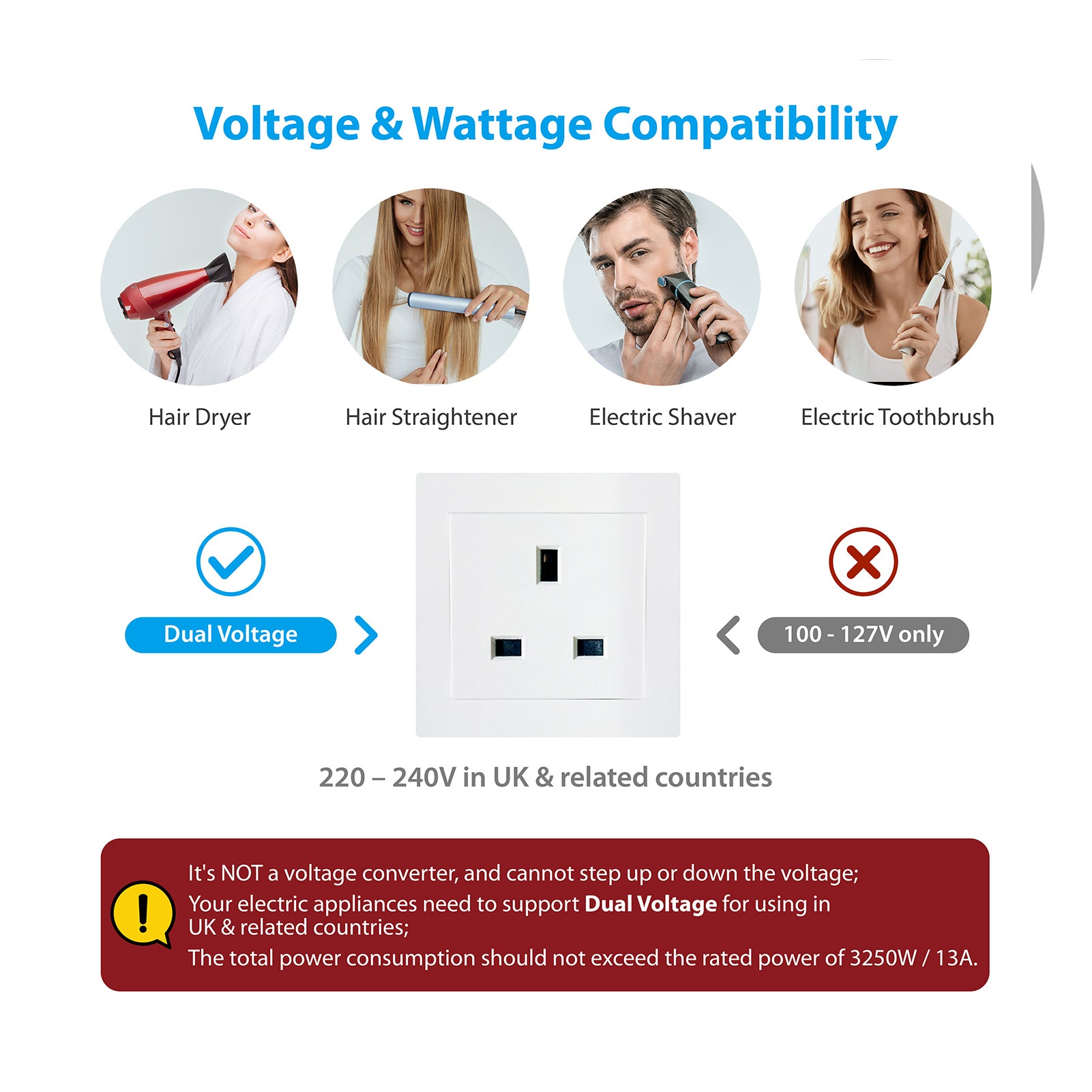 2) Your electric appliances, such as hair dryer, straightener or electric razor, need to support Dual Voltage (110V & 220V) for using in UK and related countries; otherwise, you will need a voltage converter;